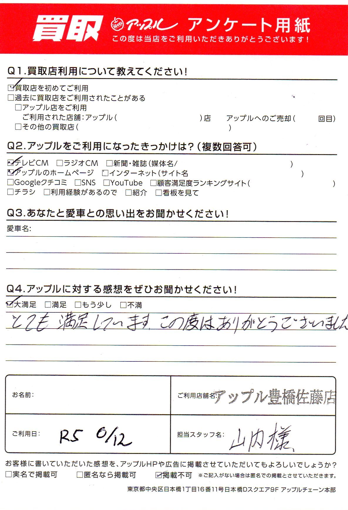 お車のご相談・ 査定だけでもOK! カンタン 入力 30秒 アップルがブランド買取始めました! お電話でも受付中! 受付時間10:00 ~ 19:00 0532-64-5911 お車のご相談・ 査定だけでもOK! カンタン 入力 30秒 アップルがブランド買取始めました! お電話でも受付中! 受付時間10:00 ~ 19:00 0532-64-5911 アップルがブランド買取始めました! お電話でも受付中! 受付時間10:00 ~ 19:00 0532-64-5911 店舗情報 在庫車 スタッフ紹介 ブログ お客様の声 キャンペーン 無料査定 click お客様の声 ご記入日: 2023/06/12 匿名希望様 とても満足しています。 この度はありがとうございました。 前へ 次へ お客様の声一覧を見る