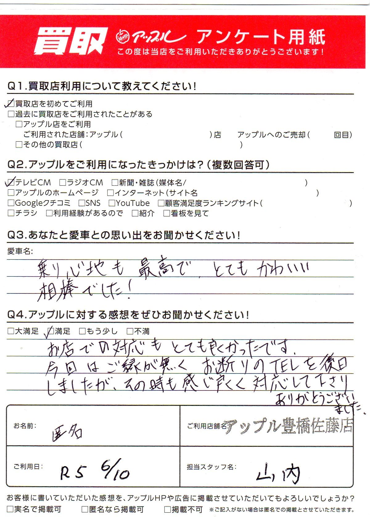お車のご相談・ 査定だけでもOK! カンタン 入力 30秒 アップルがブランド買取始めました! お電話でも受付中! 受付時間10:00 ~ 19:00 0532-64-5911 お車のご相談・ 査定だけでもOK! カンタン 入力 30秒 アップルがブランド買取始めました! お電話でも受付中! 受付時間10:00 ~ 19:00 0532-64-5911 アップルがブランド買取始めました! お電話でも受付中! 受付時間10:00 ~ 19:00 0532-64-5911 店舗情報 在庫車 スタッフ紹介 ブログ お客様の声 キャンペーン 無料査定 click お客様の声 ご記入日: 2023/06/10 匿名希望様 乗り心地も最高でとてもかわいい相棒でした!お店での対応もとても良かったです。今回はご縁が無くお断りのTELを後日しましたが、その時も感じ良く対応して下さりありがとうございました。 前へ 次へ お客様の声一覧を見る