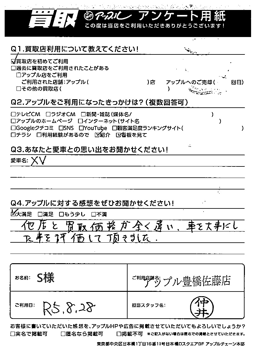 お車のご相談・ 査定だけでもOK! カンタン 入力 30秒 アップルがブランド買取始めました! お電話でも受付中! 受付時間10:00 ~ 19:00 0532-64-5911 お車のご相談・ 査定だけでもOK! カンタン 入力 30秒 アップルがブランド買取始めました! お電話でも受付中! 受付時間10:00 ~ 19:00 0532-64-5911 アップルがブランド買取始めました! お電話でも受付中! 受付時間10:00 ~ 19:00 0532-64-5911 店舗情報 在庫車 スタッフ紹介 ブログ お客様の声 キャンペーン 無料査定 click お客様の声 ご記入日: 2023/08/28 S様 車名:スバル XV (2017年5月~) Q.アップルに対する感想をぜひお聞かせください!大満足他店と買取価格が全く違い、車を大事にした事を評価して頂きました。 前へ 次へ お客様の声一覧を見る