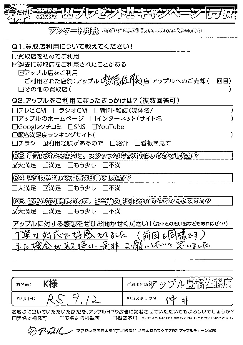 お車のご相談・ 査定だけでもOK! カンタン 入力 30秒 アップルがブランド買取始めました! お電話でも受付中! 受付時間10:00 ~ 19:00 0532-64-5911 お車のご相談・ 査定だけでもOK! カンタン 入力 30秒 アップルがブランド買取始めました! お電話でも受付中! 受付時間10:00 ~ 19:00 0532-64-5911 アップルがブランド買取始めました! お電話でも受付中! 受付時間10:00 ~ 19:00 0532-64-5911 店舗情報 在庫車 スタッフ紹介 ブログ お客様の声 キャンペーン 無料査定 click お客様の声 ご記入日: 2023/12/12 K様 ご利用日:R5年9月12日 担当:仲井Q.アップルに対する感想をぜひお聞かせください!大満足丁寧な対応で好感もてました(前回も同様です)また機会がある時は、是非お願いしたいと思いました。 前へ 次へ お客様の声一覧を見る