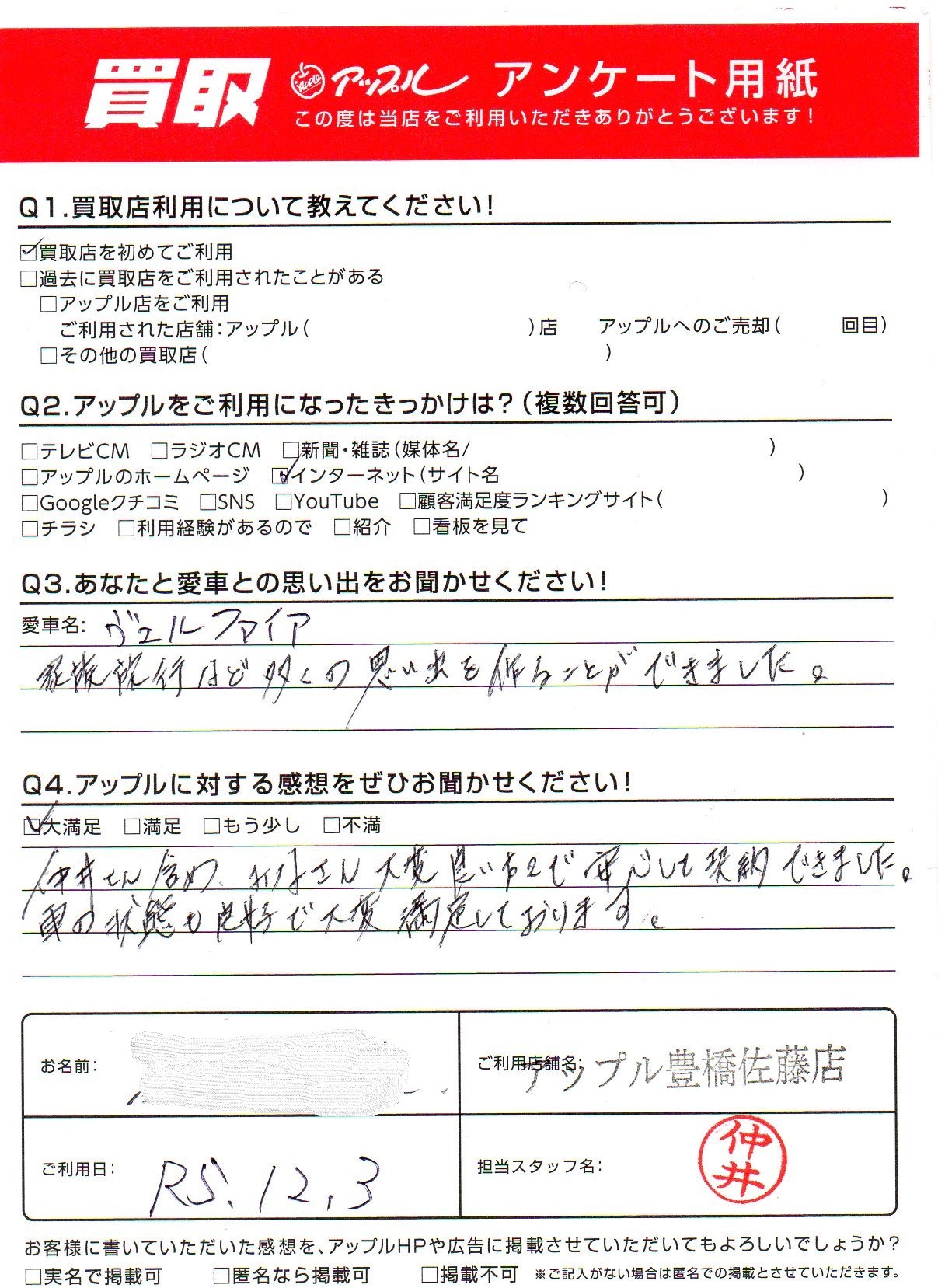 お車のご相談・ 査定だけでもOK! カンタン 入力 30秒 アップルがブランド買取始めました! お電話でも受付中! 受付時間10:00 ~ 19:00 0532-64-5911 お車のご相談・ 査定だけでもOK! カンタン 入力 30秒 アップルがブランド買取始めました! お電話でも受付中! 受付時間10:00 ~ 19:00 0532-64-5911 アップルがブランド買取始めました! お電話でも受付中! 受付時間10:00 ~ 19:00 0532-64-5911 店舗情報 在庫車 スタッフ紹介 ブログ お客様の声 キャンペーン 無料査定 click お客様の声 ご記入日: 2023/12/03 M.S様 車名:トヨタ ヴェルファイア(H27年1月~のHYBRID含む) 仲井さん含め、みなさん大変良いかたで安心して契約できました。車の状態も良好で大変満足しております 前へ 次へ お客様の声一覧を見る