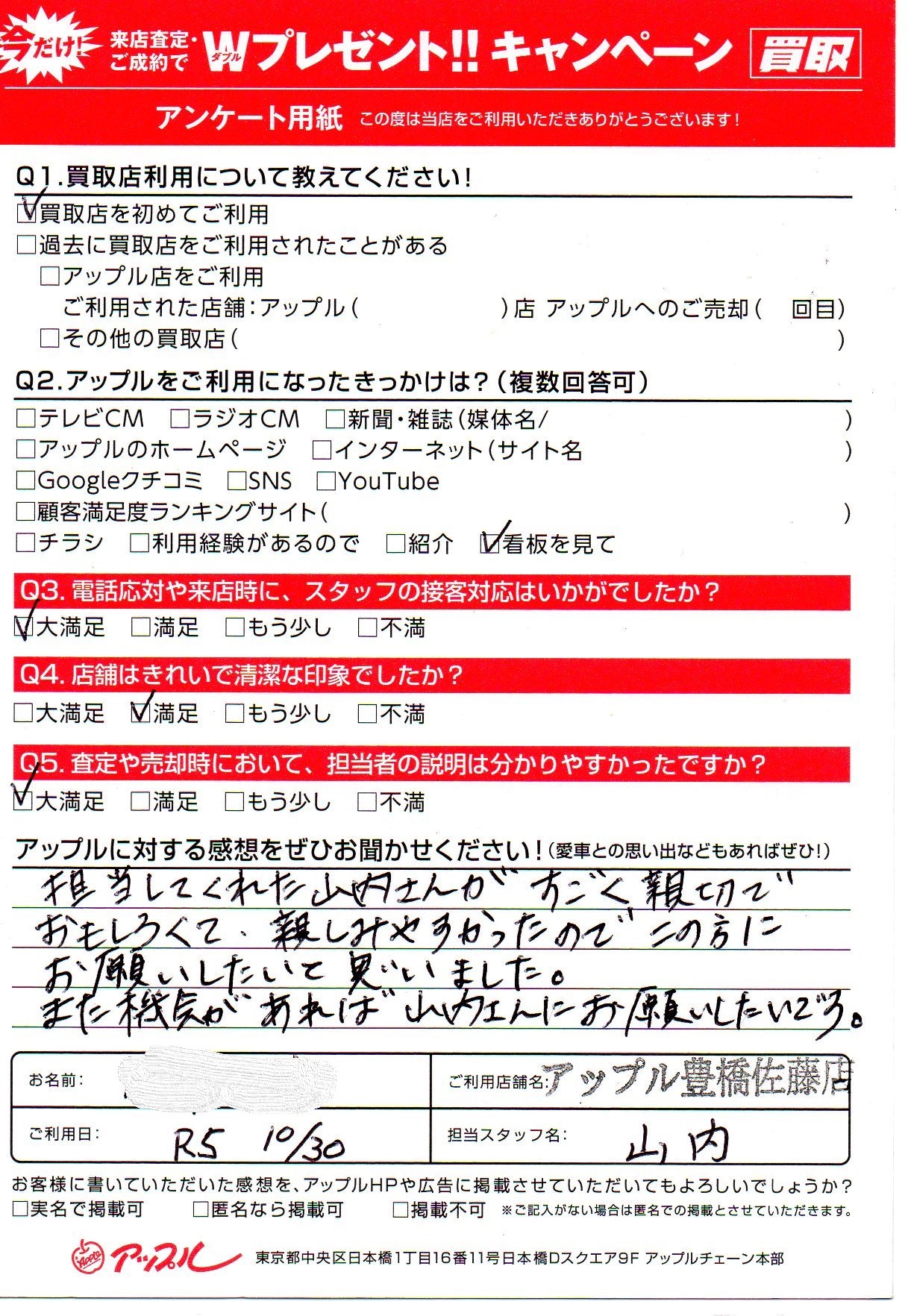 お車のご相談・ 査定だけでもOK! カンタン 入力 30秒 アップルがブランド買取始めました! お電話でも受付中! 受付時間10:00 ~ 19:00 0532-64-5911 お車のご相談・ 査定だけでもOK! カンタン 入力 30秒 アップルがブランド買取始めました! お電話でも受付中! 受付時間10:00 ~ 19:00 0532-64-5911 アップルがブランド買取始めました! お電話でも受付中! 受付時間10:00 ~ 19:00 0532-64-5911 店舗情報 在庫車 スタッフ紹介 ブログ お客様の声 キャンペーン 無料査定 click お客様の声 ご記入日: 2023/10/30 K様 担当してくれた山内さんがすごく親切でおもしろくて、親しみやすかったのでこの方にお願いしたいと思いました。また機会があれば山内さんにお願いしたいです。 前へ 次へ お客様の声一覧を見る