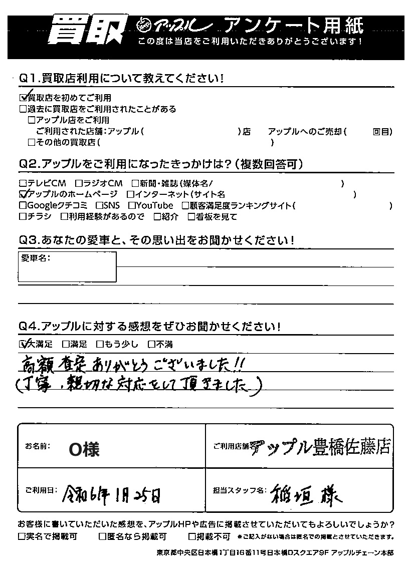 お車のご相談・ 査定だけでもOK! カンタン 入力 30秒 アップルがブランド買取始めました! お電話でも受付中! 受付時間10:00 ~ 19:00 0532-64-5911 お車のご相談・ 査定だけでもOK! カンタン 入力 30秒 アップルがブランド買取始めました! お電話でも受付中! 受付時間10:00 ~ 19:00 0532-64-5911 アップルがブランド買取始めました! お電話でも受付中! 受付時間10:00 ~ 19:00 0532-64-5911 店舗情報 在庫車 スタッフ紹介 ブログ お客様の声 キャンペーン 無料査定 click お客様の声 ご記入日: 2024/02/27 O様 ご利用日:令和6年1月25日 担当:稲垣アップルに対する感想をぜひお聞かせください!高額査定ありがとうございました!!(丁寧、親切な対応をして頂きました) 前へ 次へ お客様の声一覧を見る