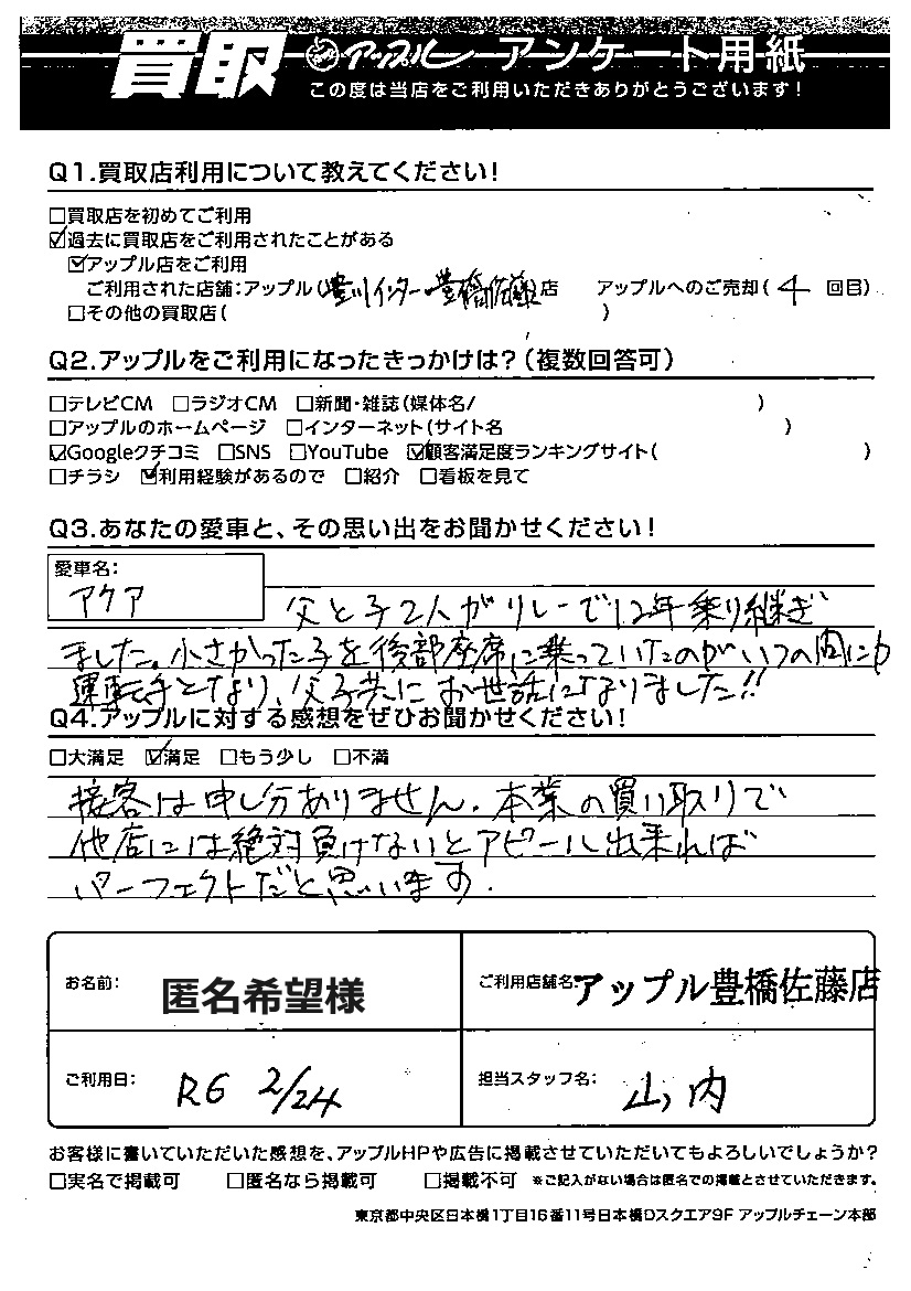 匿名希望様 車名:トヨタ アクア