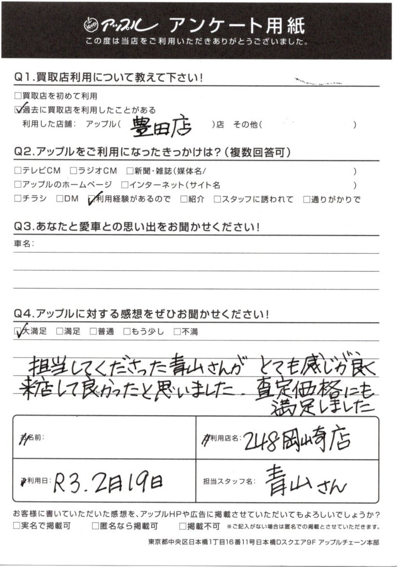 お車のご相談・ 査定だけでもOK! カンタン 入力 30秒 アップルがブランド買取始めました! お電話でも受付中! 受付時間10:00 ~ 19:00 0564-25-8118 お車のご相談・ 査定だけでもOK! カンタン 入力 30秒 アップルがブランド買取始めました! お電話でも受付中! 受付時間10:00 ~ 19:00 0564-25-8118 アップルがブランド買取始めました! お電話でも受付中! 受付時間10:00 ~ 19:00 0564-25-8118 店舗情報 在庫車 スタッフ紹介 ブログ お客様の声 キャンペーン お得 無料査定 click お客様の声 ご記入日: 2021/02/19 愛知県 匿名希望様 担当してくださった青山さんがとても感じが良く、来店して良かったと思いました。査定価格にも満足しました。 前へ 次へ お客様の声一覧を見る