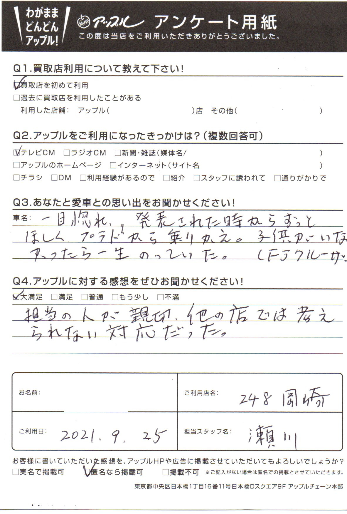 お車のご相談・ 査定だけでもOK! カンタン 入力 30秒 アップルがブランド買取始めました! お電話でも受付中! 受付時間10:00 ~ 19:00 0564-25-8118 お車のご相談・ 査定だけでもOK! カンタン 入力 30秒 アップルがブランド買取始めました! お電話でも受付中! 受付時間10:00 ~ 19:00 0564-25-8118 アップルがブランド買取始めました! お電話でも受付中! 受付時間10:00 ~ 19:00 0564-25-8118 店舗情報 在庫車 スタッフ紹介 ブログ お客様の声 キャンペーン お得 無料査定 click お客様の声 ご記入日: 2021/09/25 愛知県 匿名希望様 車名:トヨタ FJクルーザー(国内モデル 右H) 担当の人が親切、他の店では考えられないような対応だった。 前へ 次へ お客様の声一覧を見る