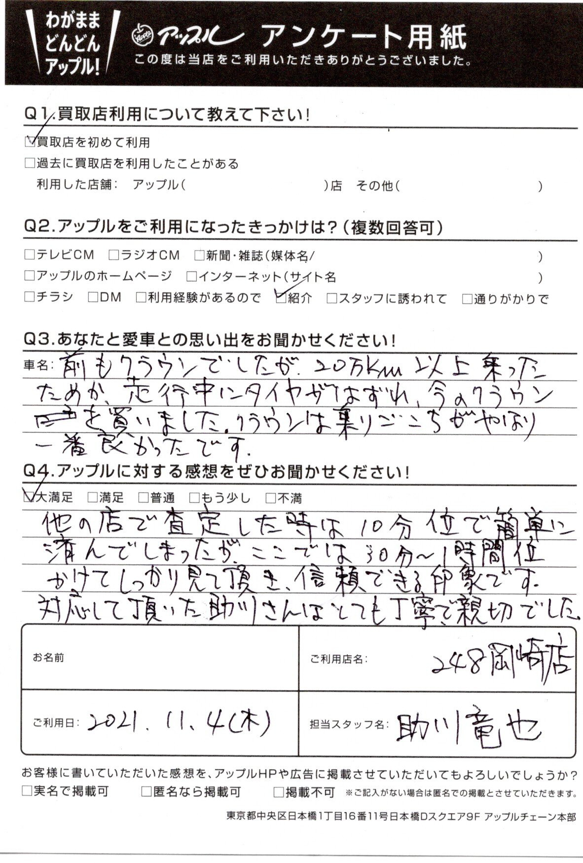 お車のご相談・ 査定だけでもOK! カンタン 入力 30秒 アップルがブランド買取始めました! お電話でも受付中! 受付時間10:00 ~ 19:00 0564-25-8118 お車のご相談・ 査定だけでもOK! カンタン 入力 30秒 アップルがブランド買取始めました! お電話でも受付中! 受付時間10:00 ~ 19:00 0564-25-8118 アップルがブランド買取始めました! お電話でも受付中! 受付時間10:00 ~ 19:00 0564-25-8118 店舗情報 在庫車 スタッフ紹介 ブログ お客様の声 キャンペーン お得 無料査定 click お客様の声 ご記入日: 2021/11/04 愛知県 匿名希望様 他の店で査定した時は10分くらいで簡単に済んでしまったが、ここでは30分~1時間位かけてしっかり見て頂き、信頼できる印象です。対応して頂いた助川さんはとても丁寧で親切でした。 前へ 次へ お客様の声一覧を見る