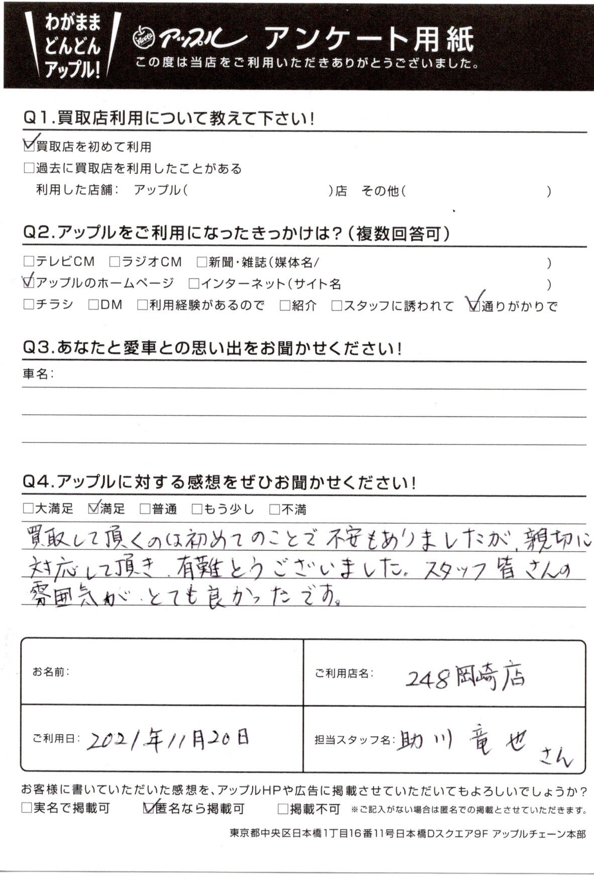 お車のご相談・ 査定だけでもOK! カンタン 入力 30秒 アップルがブランド買取始めました! お電話でも受付中! 受付時間10:00 ~ 19:00 0564-25-8118 お車のご相談・ 査定だけでもOK! カンタン 入力 30秒 アップルがブランド買取始めました! お電話でも受付中! 受付時間10:00 ~ 19:00 0564-25-8118 アップルがブランド買取始めました! お電話でも受付中! 受付時間10:00 ~ 19:00 0564-25-8118 店舗情報 在庫車 スタッフ紹介 ブログ お客様の声 キャンペーン お得 無料査定 click お客様の声 ご記入日: 2021/11/20 愛知県 匿名希望様 買取して頂くのは初めてのことで不安もありましたが、親切に対応して頂き、有難うございました。スタッフ皆さんの雰囲気がとても良かったです。 前へ 次へ お客様の声一覧を見る