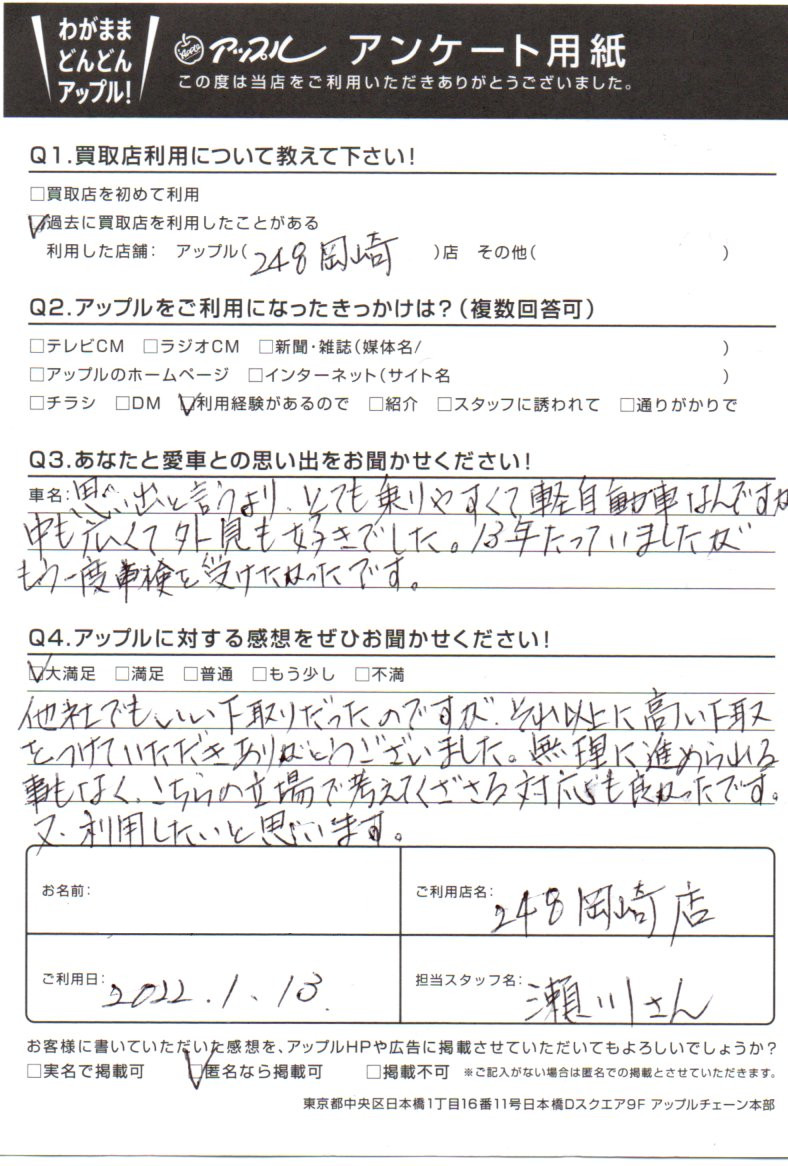 お車のご相談・ 査定だけでもOK! カンタン 入力 30秒 アップルがブランド買取始めました! お電話でも受付中! 受付時間10:00 ~ 19:00 0564-25-8118 お車のご相談・ 査定だけでもOK! カンタン 入力 30秒 アップルがブランド買取始めました! お電話でも受付中! 受付時間10:00 ~ 19:00 0564-25-8118 アップルがブランド買取始めました! お電話でも受付中! 受付時間10:00 ~ 19:00 0564-25-8118 店舗情報 在庫車 スタッフ紹介 ブログ お客様の声 キャンペーン お得 無料査定 click お客様の声 ご記入日: 2022/01/13 愛知県 匿名希望様 他社でもいい査定だったのですが、それ以上に高い下取りをつけていただきありがとうございました。無理に進められる事もなく、こちらの立場で考えてくださる対応も良かったです。又、利用したいと思います。 前へ 次へ お客様の声一覧を見る