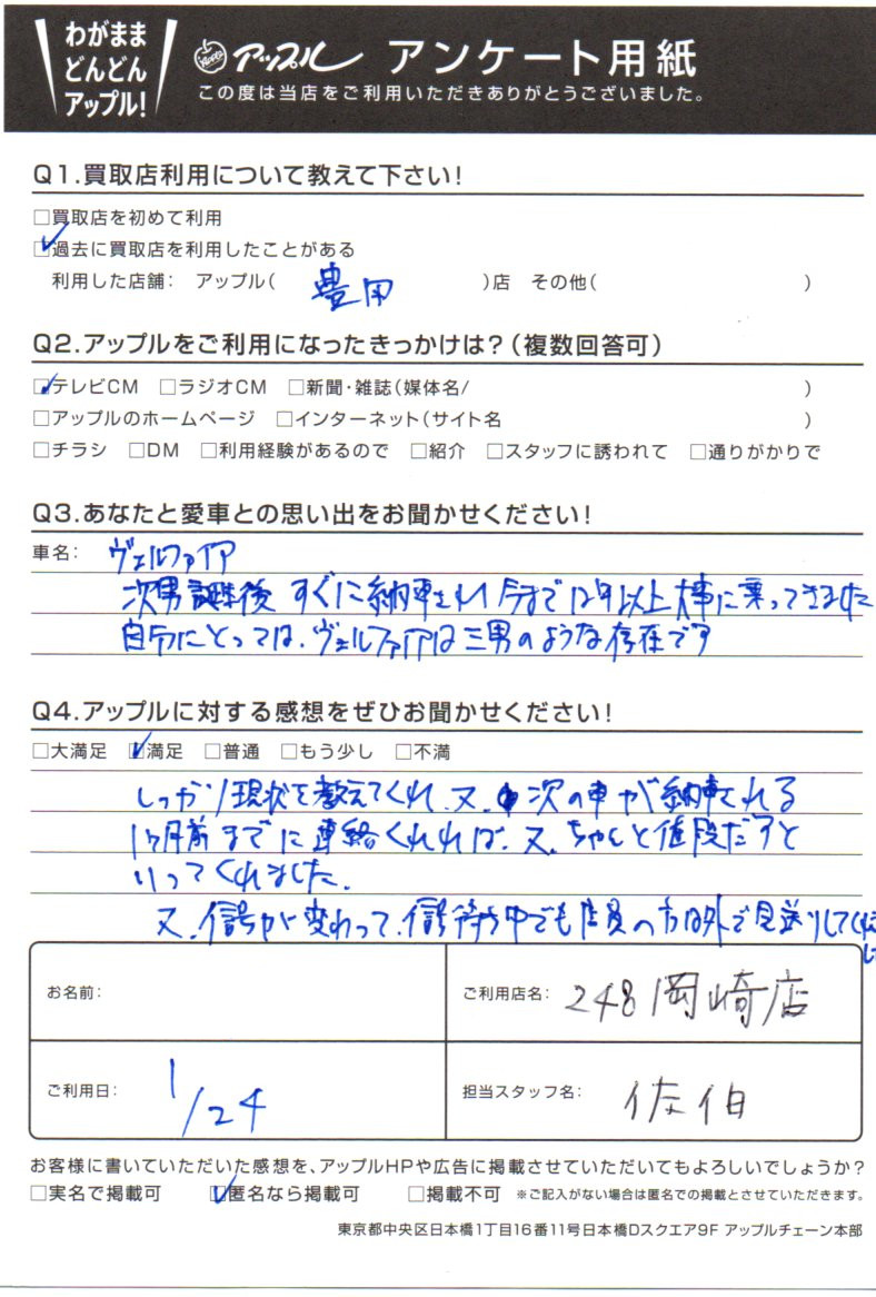 お車のご相談・ 査定だけでもOK! カンタン 入力 30秒 アップルがブランド買取始めました! お電話でも受付中! 受付時間10:00 ~ 19:00 0564-25-8118 お車のご相談・ 査定だけでもOK! カンタン 入力 30秒 アップルがブランド買取始めました! お電話でも受付中! 受付時間10:00 ~ 19:00 0564-25-8118 アップルがブランド買取始めました! お電話でも受付中! 受付時間10:00 ~ 19:00 0564-25-8118 店舗情報 在庫車 スタッフ紹介 ブログ お客様の声 キャンペーン お得 無料査定 click お客様の声 ご記入日: 2022/01/24 愛知県 匿名希望様 車名:トヨタ ヴェルファイア(H27年1月~のHYBRID含む) しっかり現状を教えてくれ、又、次の車が納車される1ヶ月前までに連絡くれれば、又、ちゃんと値段だすといってくれました。又、信号が変わって、信号待ち中でも店員の方は外で見送りしてくれました。 前へ 次へ お客様の声一覧を見る