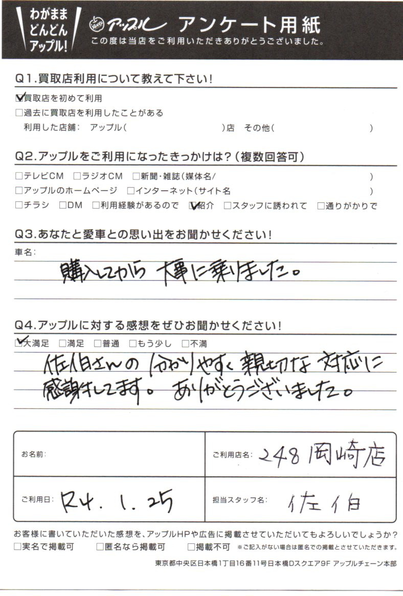 お車のご相談・ 査定だけでもOK! カンタン 入力 30秒 アップルがブランド買取始めました! お電話でも受付中! 受付時間10:00 ~ 19:00 0564-25-8118 お車のご相談・ 査定だけでもOK! カンタン 入力 30秒 アップルがブランド買取始めました! お電話でも受付中! 受付時間10:00 ~ 19:00 0564-25-8118 アップルがブランド買取始めました! お電話でも受付中! 受付時間10:00 ~ 19:00 0564-25-8118 店舗情報 在庫車 スタッフ紹介 ブログ お客様の声 キャンペーン お得 無料査定 click お客様の声 ご記入日: 2022/01/25 愛知県 匿名希望様 佐伯さんの分かりやすく親切な対応に感謝してます。ありがとうございました。 前へ 次へ お客様の声一覧を見る
