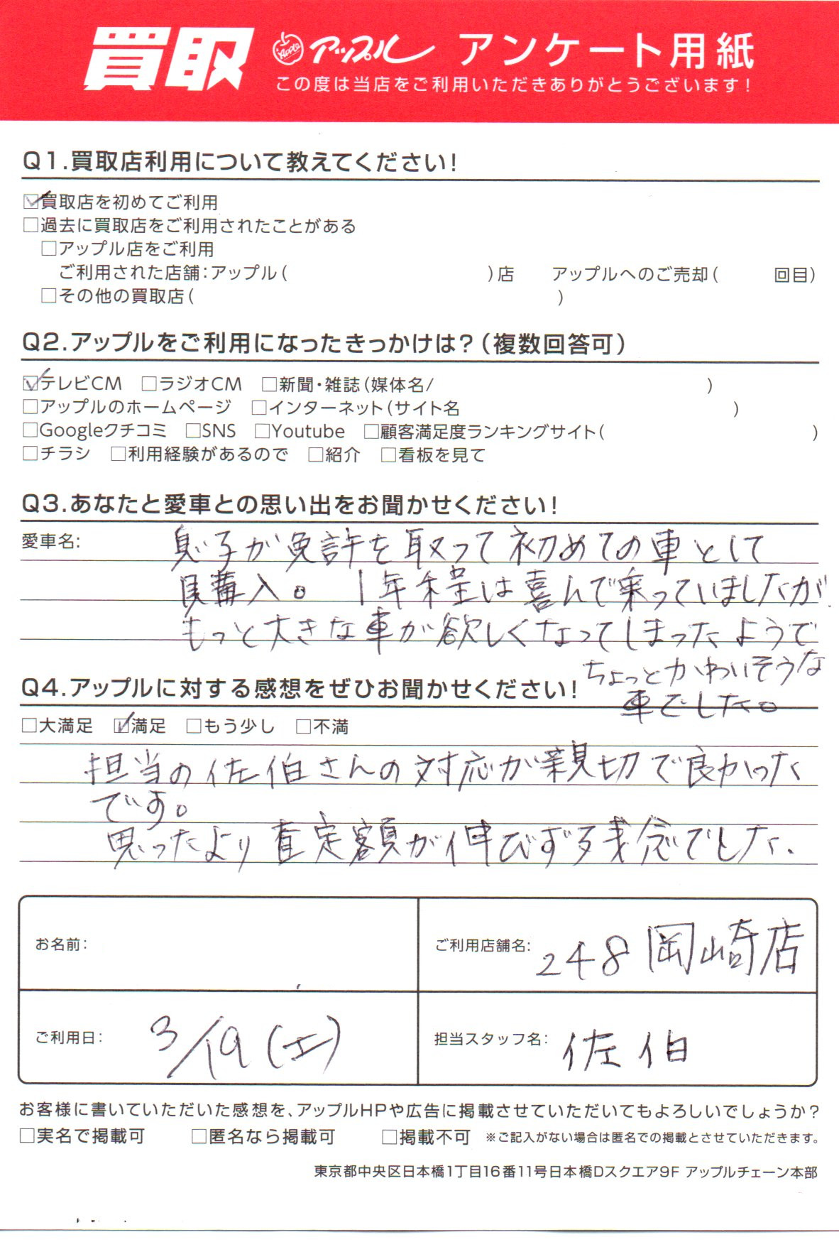 お車のご相談・ 査定だけでもOK! カンタン 入力 30秒 アップルがブランド買取始めました! お電話でも受付中! 受付時間10:00 ~ 19:00 0564-25-8118 お車のご相談・ 査定だけでもOK! カンタン 入力 30秒 アップルがブランド買取始めました! お電話でも受付中! 受付時間10:00 ~ 19:00 0564-25-8118 アップルがブランド買取始めました! お電話でも受付中! 受付時間10:00 ~ 19:00 0564-25-8118 店舗情報 在庫車 スタッフ紹介 ブログ お客様の声 キャンペーン お得 無料査定 click お客様の声 ご記入日: 2022/03/19 愛知県 匿名希望様 担当の佐伯さんの対応が親切で良かったです。思っていたより査定額が伸びず残念でした。 前へ 次へ お客様の声一覧を見る