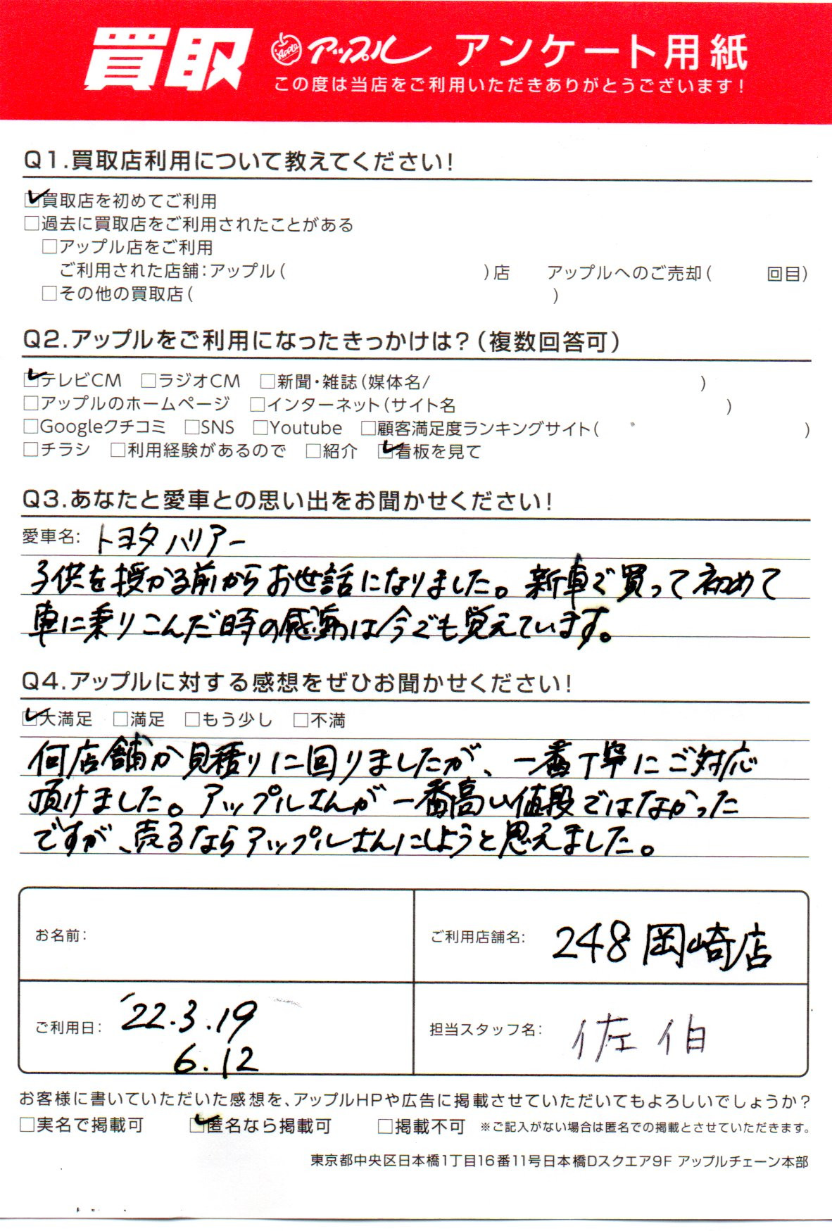 お車のご相談・ 査定だけでもOK! カンタン 入力 30秒 アップルがブランド買取始めました! お電話でも受付中! 受付時間10:00 ~ 19:00 0564-25-8118 お車のご相談・ 査定だけでもOK! カンタン 入力 30秒 アップルがブランド買取始めました! お電話でも受付中! 受付時間10:00 ~ 19:00 0564-25-8118 アップルがブランド買取始めました! お電話でも受付中! 受付時間10:00 ~ 19:00 0564-25-8118 店舗情報 在庫車 スタッフ紹介 ブログ お客様の声 キャンペーン お得 無料査定 click お客様の声 ご記入日: 2022/06/12 愛知県 匿名希望様 車名:トヨタ ハリアー (H25年12月~のハイブリッド含む) 何店舗か見積りに回りましたが、一番丁寧にご対応頂けました。アップルさんが一番高い値段ではなかったですが、売るならアップルさんにしようと思えました。 前へ 次へ お客様の声一覧を見る
