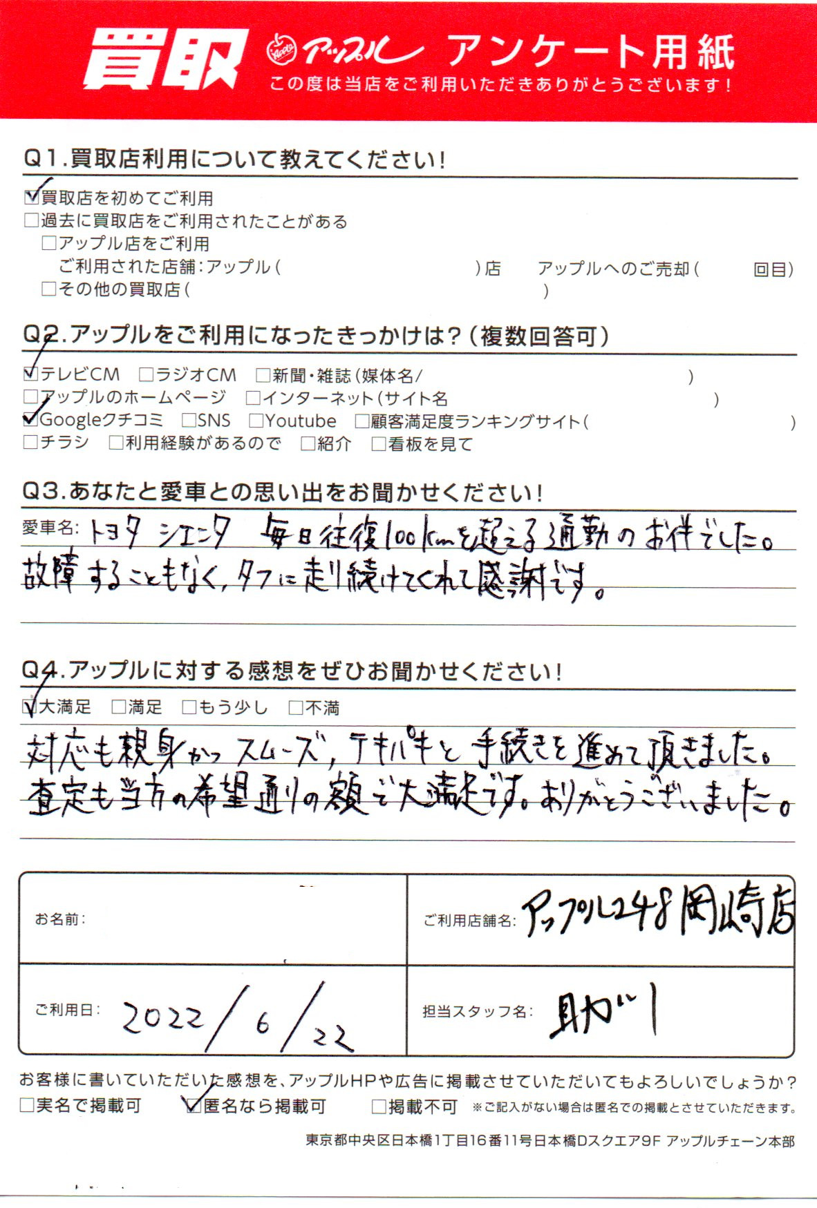 お車のご相談・ 査定だけでもOK! カンタン 入力 30秒 アップルがブランド買取始めました! お電話でも受付中! 受付時間10:00 ~ 19:00 0564-25-8118 お車のご相談・ 査定だけでもOK! カンタン 入力 30秒 アップルがブランド買取始めました! お電話でも受付中! 受付時間10:00 ~ 19:00 0564-25-8118 アップルがブランド買取始めました! お電話でも受付中! 受付時間10:00 ~ 19:00 0564-25-8118 店舗情報 在庫車 スタッフ紹介 ブログ お客様の声 キャンペーン お得 無料査定 click お客様の声 ご記入日: 2022/06/22 愛知県 匿名希望様 車名:トヨタ シエンタ 対応も親身かつスムーズ、テキパキと手続きを進めて頂きました。査定も当方の希望通りの額で大満足です。ありがとうございました。 前へ 次へ お客様の声一覧を見る