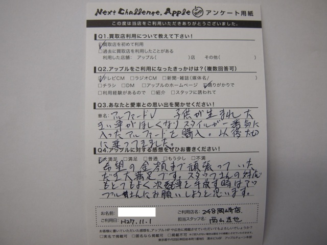 お車のご相談・ 査定だけでもOK! カンタン 入力 30秒 アップルがブランド買取始めました! お電話でも受付中! 受付時間10:00 ~ 19:00 0564-25-8118 お車のご相談・ 査定だけでもOK! カンタン 入力 30秒 アップルがブランド買取始めました! お電話でも受付中! 受付時間10:00 ~ 19:00 0564-25-8118 アップルがブランド買取始めました! お電話でも受付中! 受付時間10:00 ~ 19:00 0564-25-8118 店舗情報 在庫車 スタッフ紹介 ブログ お客様の声 キャンペーン お得 無料査定 click お客様の声 ご記入日: 2015/11/01 匿名希望様 希望金額まで頑張っていただき大満足です。スタッフさんの対応もとてもよく次も車を手放す時はアップルさんにお願いしようと思います。 前へ 次へ お客様の声一覧を見る