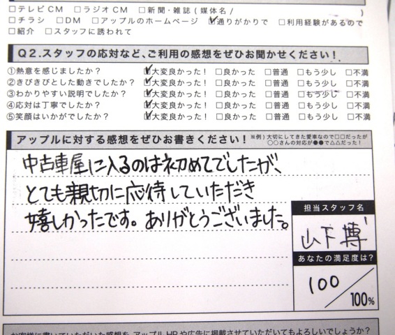 お車のご相談・ 査定だけでもOK! カンタン 入力 30秒 アップルがブランド買取始めました! お電話でも受付中! 受付時間10:00 ~ 19:00 0564-25-8118 お車のご相談・ 査定だけでもOK! カンタン 入力 30秒 アップルがブランド買取始めました! お電話でも受付中! 受付時間10:00 ~ 19:00 0564-25-8118 アップルがブランド買取始めました! お電話でも受付中! 受付時間10:00 ~ 19:00 0564-25-8118 店舗情報 在庫車 スタッフ紹介 ブログ お客様の声 キャンペーン お得 無料査定 click お客様の声 ご記入日: 2011/10/01 M.T様 中古車屋に入るのは初めてでしたが、とても親切に応待していただき嬉しかったです。ありがとうございました。 前へ 次へ お客様の声一覧を見る