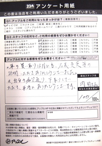 お車のご相談・ 査定だけでもOK! カンタン 入力 30秒 アップルがブランド買取始めました! お電話でも受付中! 受付時間10:00 ~ 19:00 0564-25-8118 お車のご相談・ 査定だけでもOK! カンタン 入力 30秒 アップルがブランド買取始めました! お電話でも受付中! 受付時間10:00 ~ 19:00 0564-25-8118 アップルがブランド買取始めました! お電話でも受付中! 受付時間10:00 ~ 19:00 0564-25-8118 店舗情報 在庫車 スタッフ紹介 ブログ お客様の声 キャンペーン お得 無料査定 click お客様の声 ご記入日: 2012/02/07 無記名様 車の買い取り以外にも名義変更等の説明いただきありがとうございました。又、自分の希望通り、下取りしていただき本当にありがとうございます。 前へ 次へ お客様の声一覧を見る