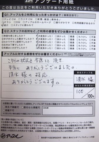 お車のご相談・ 査定だけでもOK! カンタン 入力 30秒 アップルがブランド買取始めました! お電話でも受付中! 受付時間10:00 ~ 19:00 0564-25-8118 お車のご相談・ 査定だけでもOK! カンタン 入力 30秒 アップルがブランド買取始めました! お電話でも受付中! 受付時間10:00 ~ 19:00 0564-25-8118 アップルがブランド買取始めました! お電話でも受付中! 受付時間10:00 ~ 19:00 0564-25-8118 店舗情報 在庫車 スタッフ紹介 ブログ お客様の声 キャンペーン お得 無料査定 click お客様の声 ご記入日: 2012/02/18 無記名様 こちらの状況を考慮して頂き、本当にありがとうございました。清水様の対応、ありがとうございます。 前へ 次へ お客様の声一覧を見る