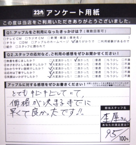 お車のご相談・ 査定だけでもOK! カンタン 入力 30秒 アップルがブランド買取始めました! お電話でも受付中! 受付時間10:00 ~ 19:00 0564-25-8118 お車のご相談・ 査定だけでもOK! カンタン 入力 30秒 アップルがブランド買取始めました! お電話でも受付中! 受付時間10:00 ~ 19:00 0564-25-8118 アップルがブランド買取始めました! お電話でも受付中! 受付時間10:00 ~ 19:00 0564-25-8118 店舗情報 在庫車 スタッフ紹介 ブログ お客様の声 キャンペーン お得 無料査定 click お客様の声 ご記入日: 2012/03/12 M.A様 とてもキビキビしていて、価格が決まるまでに早くて良かったです!! 前へ 次へ お客様の声一覧を見る