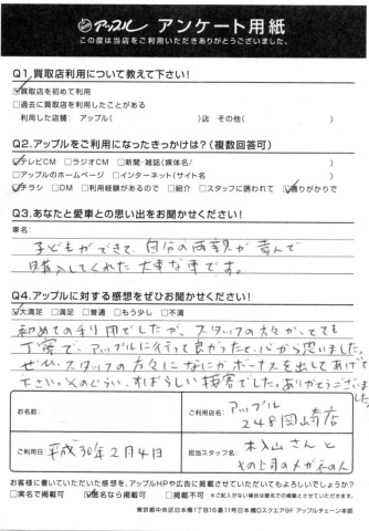 Q2.アップルに対する乾燥をお聞かせください!・・・初めての利用でしたが、スタッフの方々がとても丁寧で、アップルに行って良かったと心から思いました。ぜひスタッフの方々になにかボーナスを出してあげて下さい。そのぐらいすばらしい接客でした。ありがとうございました。