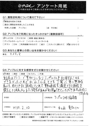 Q1.アップルに対する感想をお聞かせください!・・・結局はディーラーで買取りになりアップルさんを利用することはできなかったけれど、杁山さんはとても丁寧に車に無知な私にもわかりやすく説明してくれて買取値段も満足いく値段を提示してくれました。また機会があれば利用させていただきます。ありがとうございました。
