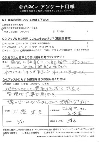 Q2.アップルに対する感想をお聞かせください!・・・他社に比べて買取りも高く対応も皆親切丁寧であります。嫁のビートルもアップルさんに世話になりました。