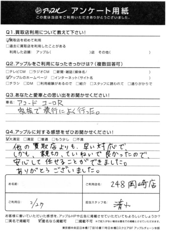 お車のご相談・ 査定だけでもOK! カンタン 入力 30秒 アップルがブランド買取始めました! お電話でも受付中! 受付時間10:00 ~ 19:00 0564-25-8118 お車のご相談・ 査定だけでもOK! カンタン 入力 30秒 アップルがブランド買取始めました! お電話でも受付中! 受付時間10:00 ~ 19:00 0564-25-8118 アップルがブランド買取始めました! お電話でも受付中! 受付時間10:00 ~ 19:00 0564-25-8118 店舗情報 在庫車 スタッフ紹介 ブログ お客様の声 キャンペーン お得 無料査定 click お客様の声 ご記入日: 2018/02/27 岡崎市 匿名希望様 Q1.愛車との思い出をお聞かせください!・・・家族で旅行によく行った。Q2.アップルに対する感想をお聞かせください!・・・他の買取店よりも早い対応で、しかも親切、ていねいで良かったので、安心して任せることができました。ありがとうございました。担当スタッフ:清水 前へ 次へ お客様の声一覧を見る