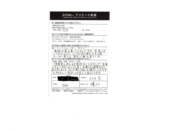 Q2 アップルに対する感想を是非お聞かせください!・・・一度査定に行き、まだ売却はしていませんが店員の方々の対応はとても良く社員の方の教育がとてもいいと思いました。ディーラー等の下取りを検討していますがアップルさんに売却しても良いと考えています。