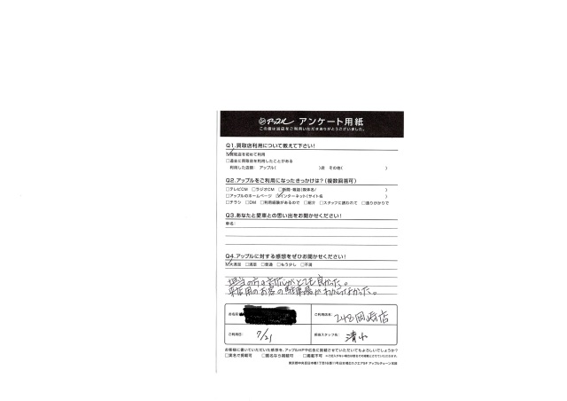 お車のご相談・ 査定だけでもOK! カンタン 入力 30秒 アップルがブランド買取始めました! お電話でも受付中! 受付時間10:00 ~ 19:00 0564-25-8118 お車のご相談・ 査定だけでもOK! カンタン 入力 30秒 アップルがブランド買取始めました! お電話でも受付中! 受付時間10:00 ~ 19:00 0564-25-8118 アップルがブランド買取始めました! お電話でも受付中! 受付時間10:00 ~ 19:00 0564-25-8118 店舗情報 在庫車 スタッフ紹介 ブログ お客様の声 キャンペーン お得 無料査定 click お客様の声 ご記入日: 2018/07/21 K様 Q1 アップルに対する感想をぜひお聞かせください!担当の方の対応がとてもよかった!来店用のお客様駐車場がわからなかった。 前へ 次へ お客様の声一覧を見る