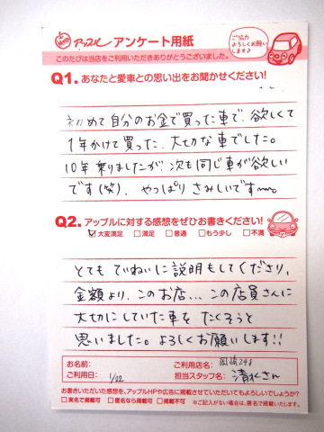 とてもていねいに説明もしてくださり、金額より、このお店、、、、この店員さんに大切にしていた車をたくそうと思いました。