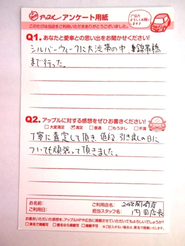 お車のご相談・ 査定だけでもOK! カンタン 入力 30秒 アップルがブランド買取始めました! お電話でも受付中! 受付時間10:00 ~ 19:00 0564-25-8118 お車のご相談・ 査定だけでもOK! カンタン 入力 30秒 アップルがブランド買取始めました! お電話でも受付中! 受付時間10:00 ~ 19:00 0564-25-8118 アップルがブランド買取始めました! お電話でも受付中! 受付時間10:00 ~ 19:00 0564-25-8118 店舗情報 在庫車 スタッフ紹介 ブログ お客様の声 キャンペーン お得 無料査定 click お客様の声 ご記入日: 2013/02/02 無記名様 愛車との思い出・・・・・シルバーウィークに大渋滞の中、錦帯橋まで行った。アップルに対する感想・・・丁寧に査定して頂き、値段、引渡しの日についても頑張って頂きました。担当より・・・・この度はありがとうございました!! 次回ももっともっと頑張ります!!! アップルをどうぞ宜しくお願いします♪ 前へ 次へ お客様の声一覧を見る