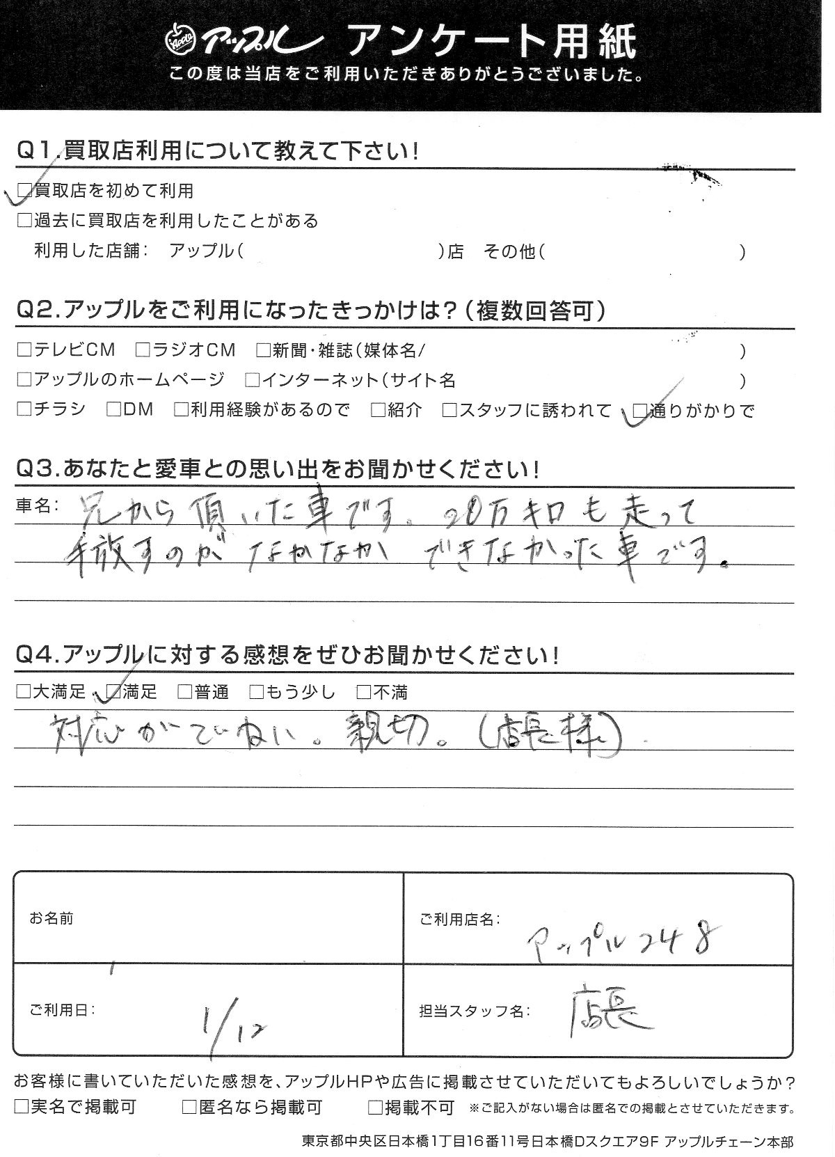 お車のご相談・ 査定だけでもOK! カンタン 入力 30秒 アップルがブランド買取始めました! お電話でも受付中! 受付時間10:00 ~ 19:00 0564-25-8118 お車のご相談・ 査定だけでもOK! カンタン 入力 30秒 アップルがブランド買取始めました! お電話でも受付中! 受付時間10:00 ~ 19:00 0564-25-8118 アップルがブランド買取始めました! お電話でも受付中! 受付時間10:00 ~ 19:00 0564-25-8118 店舗情報 在庫車 スタッフ紹介 ブログ お客様の声 キャンペーン お得 無料査定 click お客様の声 ご記入日: 2020/01/12 愛知県 匿名希望様 対応がていねい。親切。 前へ 次へ お客様の声一覧を見る