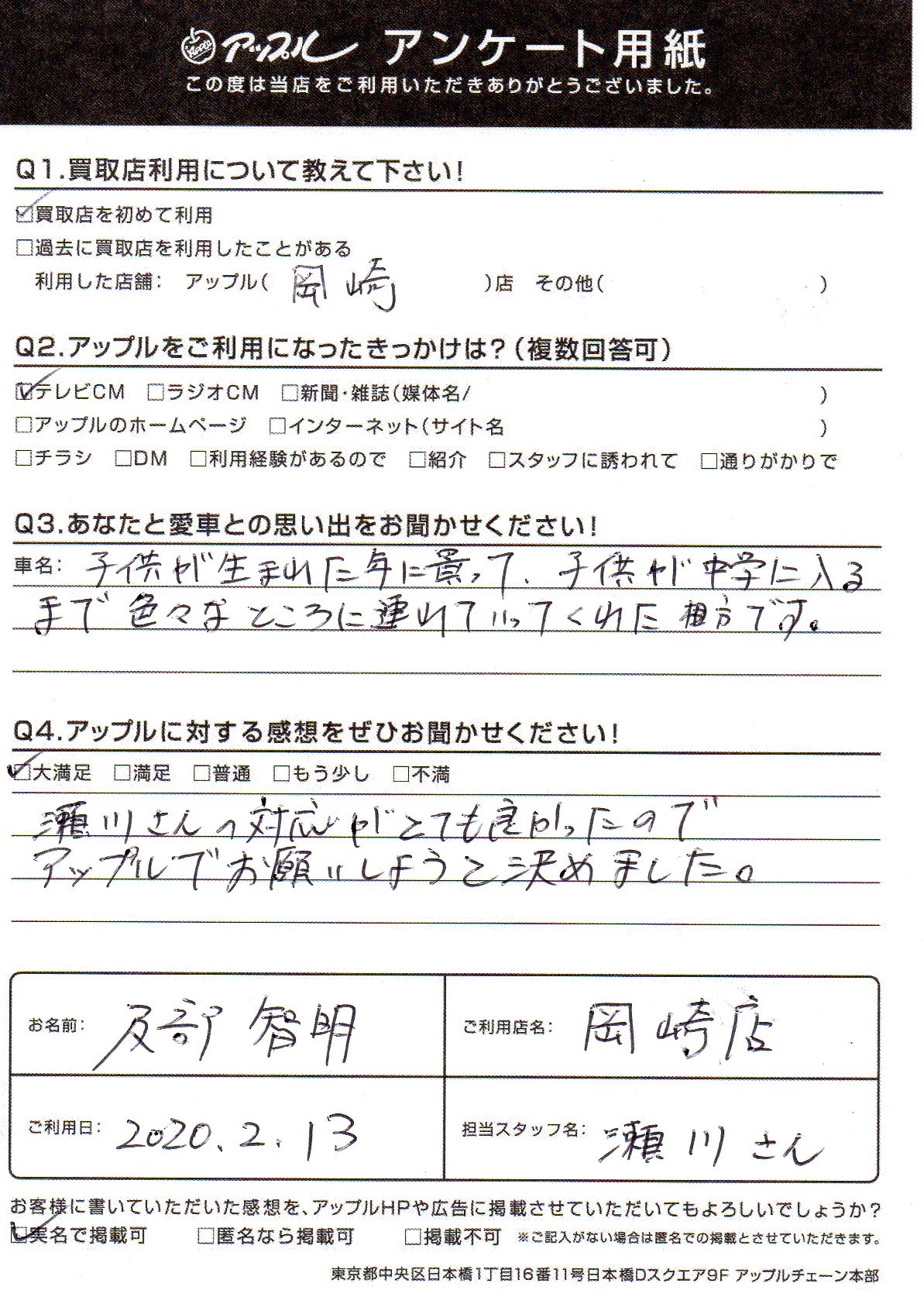 お車のご相談・ 査定だけでもOK! カンタン 入力 30秒 アップルがブランド買取始めました! お電話でも受付中! 受付時間10:00 ~ 19:00 0564-25-8118 お車のご相談・ 査定だけでもOK! カンタン 入力 30秒 アップルがブランド買取始めました! お電話でも受付中! 受付時間10:00 ~ 19:00 0564-25-8118 アップルがブランド買取始めました! お電話でも受付中! 受付時間10:00 ~ 19:00 0564-25-8118 店舗情報 在庫車 スタッフ紹介 ブログ お客様の声 キャンペーン お得 無料査定 click お客様の声 ご記入日: 2020/02/13 及部智明様 瀬川さんの対応がとても良かったのでアップルでお願いしようと決めました。 前へ 次へ お客様の声一覧を見る