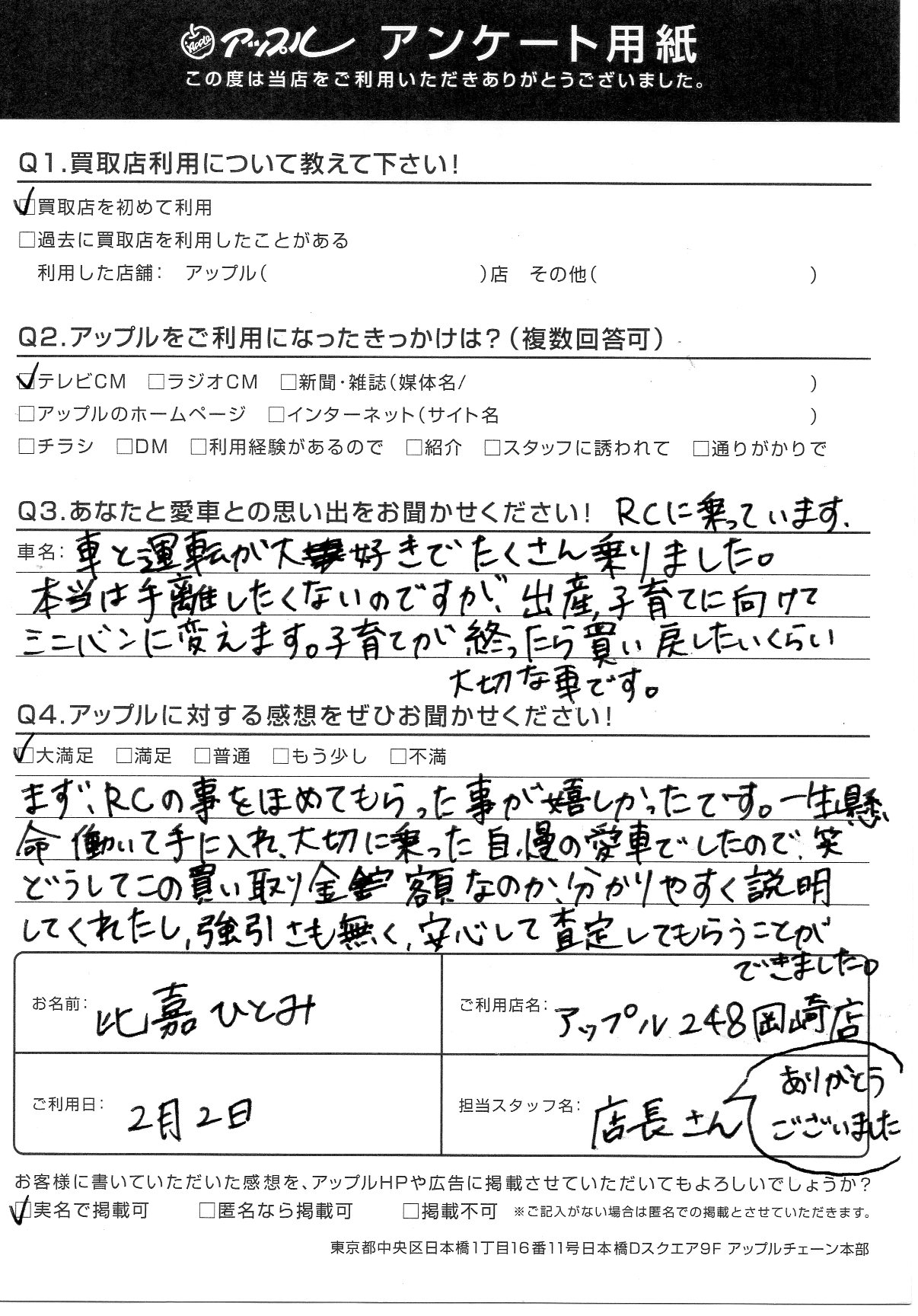 お車のご相談・ 査定だけでもOK! カンタン 入力 30秒 アップルがブランド買取始めました! お電話でも受付中! 受付時間10:00 ~ 19:00 0564-25-8118 お車のご相談・ 査定だけでもOK! カンタン 入力 30秒 アップルがブランド買取始めました! お電話でも受付中! 受付時間10:00 ~ 19:00 0564-25-8118 アップルがブランド買取始めました! お電話でも受付中! 受付時間10:00 ~ 19:00 0564-25-8118 店舗情報 在庫車 スタッフ紹介 ブログ お客様の声 キャンペーン お得 無料査定 click お客様の声 ご記入日: 2020/02/02 比嘉ひとみ様 車名:レクサス RC まず、RCの事をほめてもらった事が嬉しかったです。一生懸命働いて手に入れ、大切に乗った自慢の愛車でしたので、笑 どうしてこの買い取り金額なのか、分かりやすく説明してくれたし、強引さも無く、安心して査定してもらうことができました。店長さん、ありがとうございました。 前へ 次へ お客様の声一覧を見る
