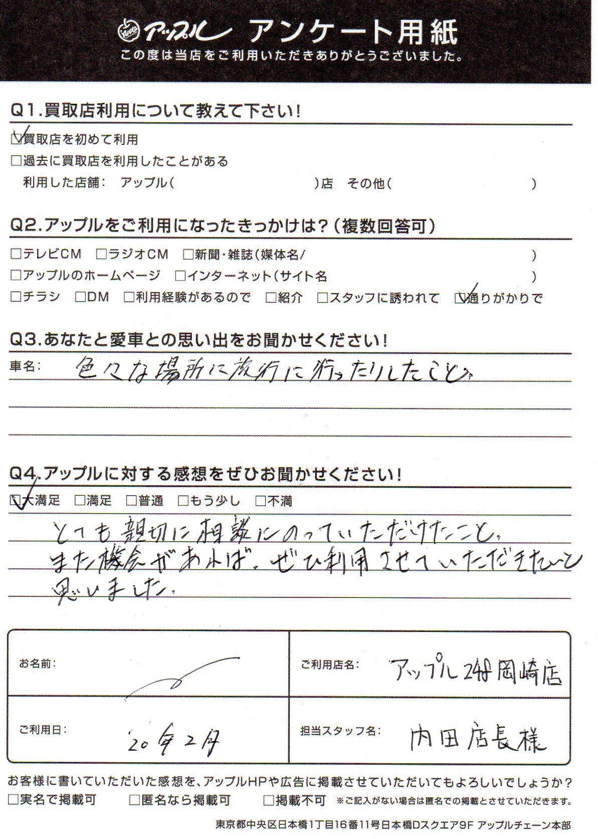 お車のご相談・ 査定だけでもOK! カンタン 入力 30秒 アップルがブランド買取始めました! お電話でも受付中! 受付時間10:00 ~ 19:00 0564-25-8118 お車のご相談・ 査定だけでもOK! カンタン 入力 30秒 アップルがブランド買取始めました! お電話でも受付中! 受付時間10:00 ~ 19:00 0564-25-8118 アップルがブランド買取始めました! お電話でも受付中! 受付時間10:00 ~ 19:00 0564-25-8118 店舗情報 在庫車 スタッフ紹介 ブログ お客様の声 キャンペーン お得 無料査定 click お客様の声 ご記入日: 2020/02/01 愛知県 匿名希望様 とても親切に相談にのっていただけたこと。また機会があれば、ぜひ利用させていただきたいと思いました。 前へ 次へ お客様の声一覧を見る