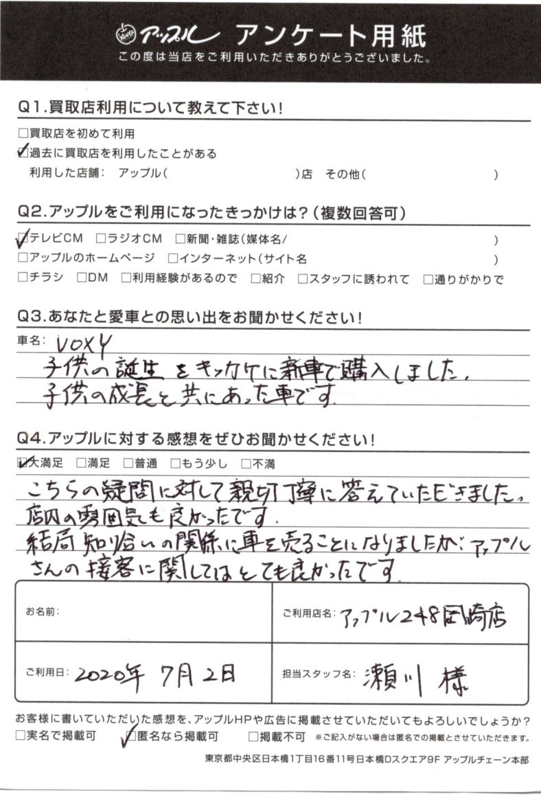 お車のご相談・ 査定だけでもOK! カンタン 入力 30秒 アップルがブランド買取始めました! お電話でも受付中! 受付時間10:00 ~ 19:00 0564-25-8118 お車のご相談・ 査定だけでもOK! カンタン 入力 30秒 アップルがブランド買取始めました! お電話でも受付中! 受付時間10:00 ~ 19:00 0564-25-8118 アップルがブランド買取始めました! お電話でも受付中! 受付時間10:00 ~ 19:00 0564-25-8118 店舗情報 在庫車 スタッフ紹介 ブログ お客様の声 キャンペーン お得 無料査定 click お客様の声 ご記入日: 2020/07/02 愛知県 匿名希望様 車名:トヨタ ヴォクシー こちらの疑問に対して親切丁寧に答えていただきました。店内の雰囲気も良かったです。結局知り合いの関係に車を売ることになりましたが、アップルさんの接客に関してはとても良かったです。 前へ 次へ お客様の声一覧を見る