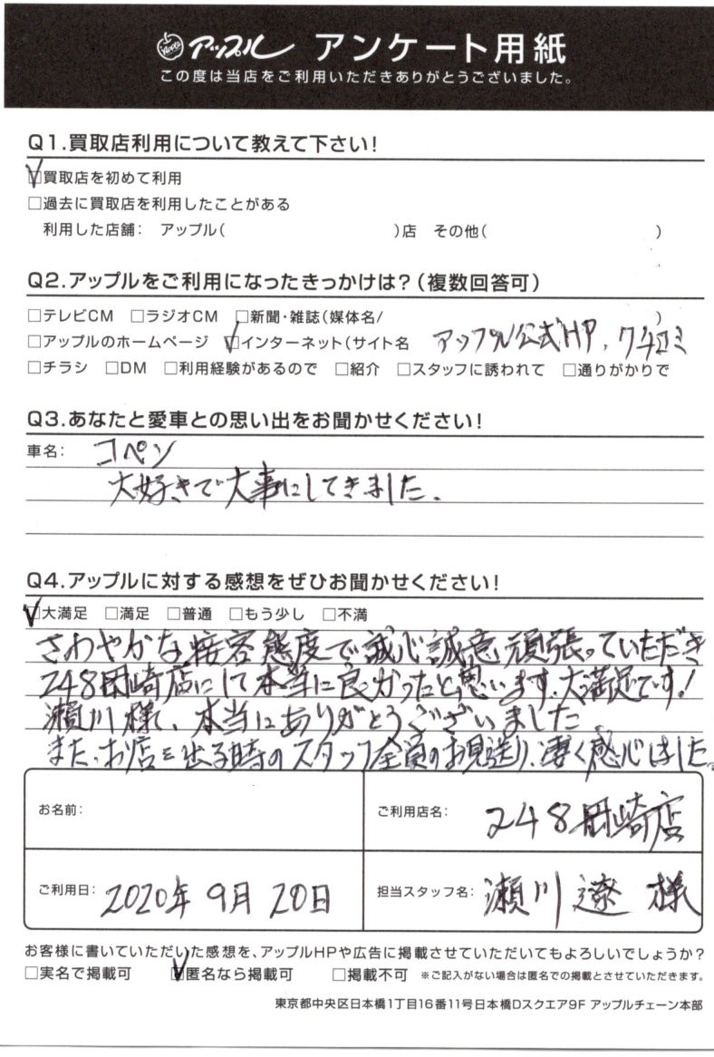お車のご相談・ 査定だけでもOK! カンタン 入力 30秒 アップルがブランド買取始めました! お電話でも受付中! 受付時間10:00 ~ 19:00 0564-25-8118 お車のご相談・ 査定だけでもOK! カンタン 入力 30秒 アップルがブランド買取始めました! お電話でも受付中! 受付時間10:00 ~ 19:00 0564-25-8118 アップルがブランド買取始めました! お電話でも受付中! 受付時間10:00 ~ 19:00 0564-25-8118 店舗情報 在庫車 スタッフ紹介 ブログ お客様の声 キャンペーン お得 無料査定 click お客様の声 ご記入日: 2020/09/20 愛知県 匿名希望様 車名:ダイハツ コペン さわやかな接客態度で誠心誠意頑張っていただき、248岡崎店にして本当に良かったと思います。大変満足です! 瀬川様、本当にありがとうございました。また、お店を出る時のスタッフ全員のお見送り、凄く感心しました。 前へ 次へ お客様の声一覧を見る
