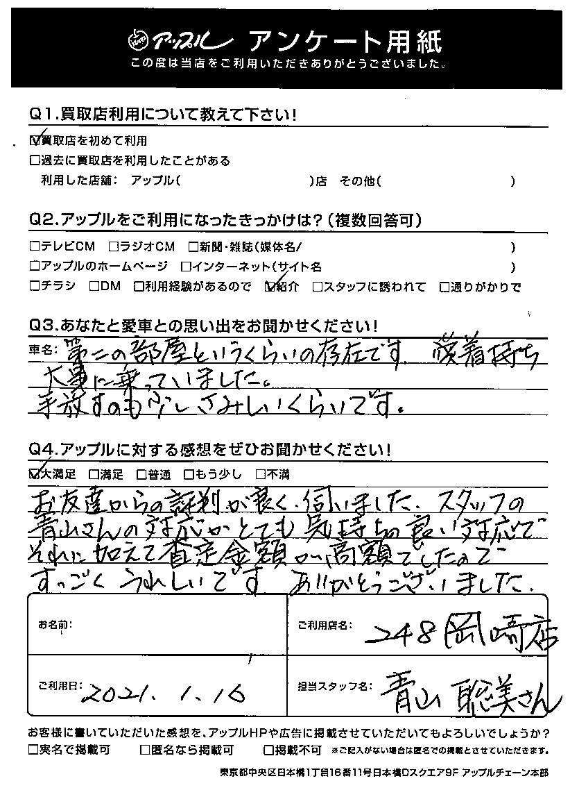 お車のご相談・ 査定だけでもOK! カンタン 入力 30秒 アップルがブランド買取始めました! お電話でも受付中! 受付時間10:00 ~ 19:00 0564-25-8118 お車のご相談・ 査定だけでもOK! カンタン 入力 30秒 アップルがブランド買取始めました! お電話でも受付中! 受付時間10:00 ~ 19:00 0564-25-8118 アップルがブランド買取始めました! お電話でも受付中! 受付時間10:00 ~ 19:00 0564-25-8118 店舗情報 在庫車 スタッフ紹介 ブログ お客様の声 キャンペーン お得 無料査定 click お客様の声 ご記入日: 2021/01/16 愛知県 匿名希望様 お友達からの評判が良く、伺いました。スタッフの青山さんの対応がとても気持ちの良い対応で、それに加えて査定金額が高額でしたのですごくうれしいです。ありがとうございました。 前へ 次へ お客様の声一覧を見る