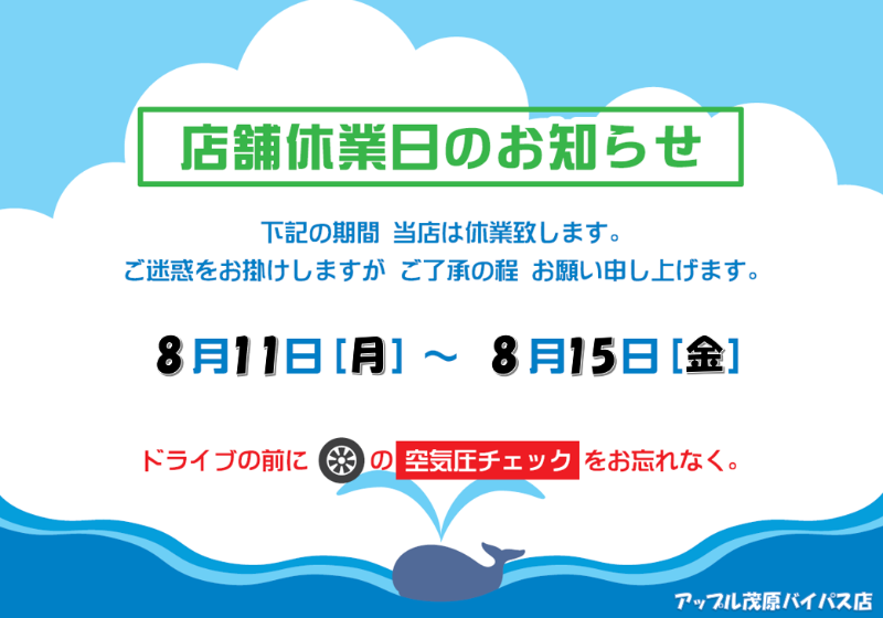 お車のご相談・ 査定だけでもOK! カンタン 入力 30秒 アップルがブランド買取始めました! お電話でも受付中! 受付時間【10:00-18:00 】 0120-24-9311 お車のご相談・ 査定だけでもOK! カンタン 入力 30秒 アップルがブランド買取始めました! お電話でも受付中! 受付時間【10:00-18:00 】 0120-24-9311 アップルがブランド買取始めました! お電話でも受付中! 受付時間【10:00-18:00 】 0120-24-9311 店舗情報 在庫車 スタッフ紹介 ブログ お客様の声 キャンペーン 無料査定 click [ 未分類 ] 2025/08/05 (火) 15:16 2025夏季休業のお知らせ 当店では、上記の通り8月11日~15日まで店休とさせていただきます。期間中に頂きましたお問い合わせに関しましては翌営業日より順次対応させていただきます。ご迷惑をお掛けいたしますが何卒よろしくお願いいたします。🍎アップル茂原バイパス店🍎 2025-08-05 15:16:15 新しい記事へ 古い記事へ 最新記事 臨時休業のお知らせご挨拶年末年始休業のお知らせ定休日変更のお知らせ2025夏季休業のお知らせ 店舗情報に戻る 月別アーカイブ 2026年01月(2)2025年12月(2)2025年08月(1)2024年12月(1)2024年11月(1)2024年10月(4)2024年08月(1)2024年07月(1)2024年01月(1)2023年12月(1)2023年10月(1)2023年09月(2)2023年08月(1)2023年07月(3)2023年06月(1)2023年04月(1)2023年02月(2)2023年01月(1)2022年12月(2)2022年11月(1)2022年10月(2)2022年09月(2)2022年08月(2)2022年07月(3)2022年03月(1)2021年11月(1)2021年08月(1)2021年07月(1)2020年11月(1)
