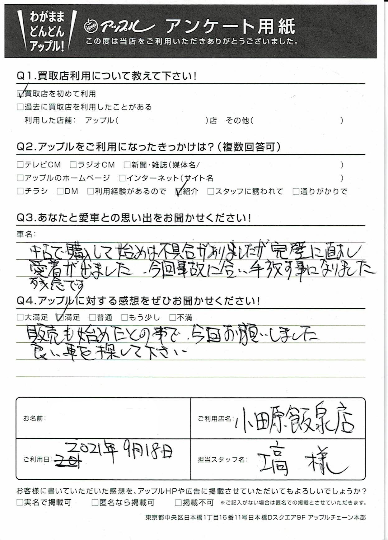 お車のご相談・ 査定だけでもOK! カンタン 入力 30秒 アップルがブランド買取始めました! お電話でも受付中! 受付時間10:00 ~ 19:00 0465-49-5503 お車のご相談・ 査定だけでもOK! カンタン 入力 30秒 アップルがブランド買取始めました! お電話でも受付中! 受付時間10:00 ~ 19:00 0465-49-5503 アップルがブランド買取始めました! お電話でも受付中! 受付時間10:00 ~ 19:00 0465-49-5503 店舗情報 在庫車 スタッフ紹介 ブログ お客様の声 キャンペーン 無料査定 click お客様の声 ご記入日: 2021/09/18 U様 車名:日産 デイズルークス 販売も始めたとのことで今回お願いしました。良い車を探して下さい。 前へ 次へ お客様の声一覧を見る