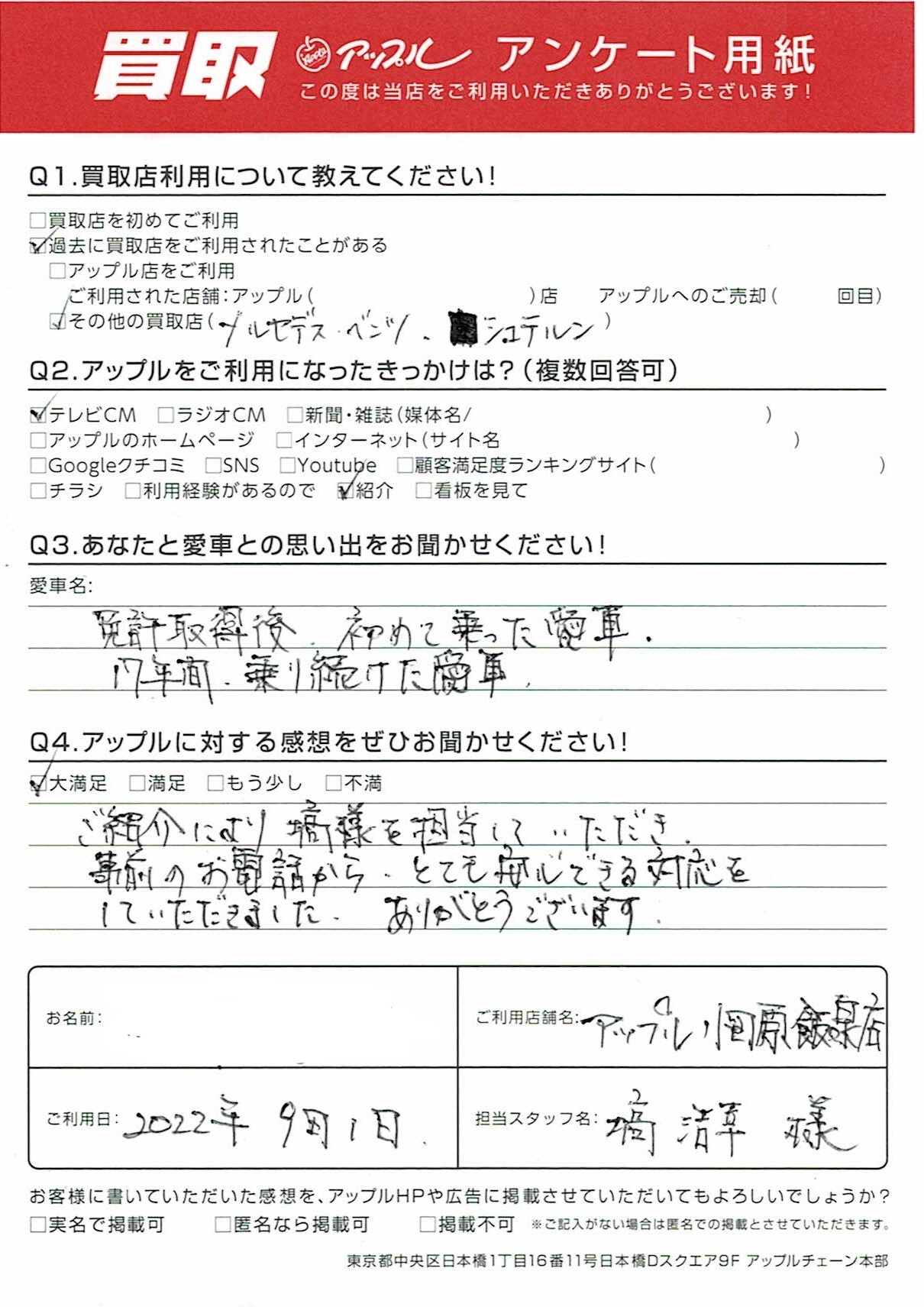 お車のご相談・ 査定だけでもOK! カンタン 入力 30秒 アップルがブランド買取始めました! お電話でも受付中! 受付時間10:00 ~ 19:00 0465-49-5503 お車のご相談・ 査定だけでもOK! カンタン 入力 30秒 アップルがブランド買取始めました! お電話でも受付中! 受付時間10:00 ~ 19:00 0465-49-5503 アップルがブランド買取始めました! お電話でも受付中! 受付時間10:00 ~ 19:00 0465-49-5503 店舗情報 在庫車 スタッフ紹介 ブログ お客様の声 キャンペーン 無料査定 click お客様の声 ご記入日: 2022/09/01 T様 車名:メルセデス・ベンツ Cクラス ご紹介により塙様に担当して頂き事前のお電話からとても安心できる対応をして頂きました。ありがとうございました。 前へ 次へ お客様の声一覧を見る