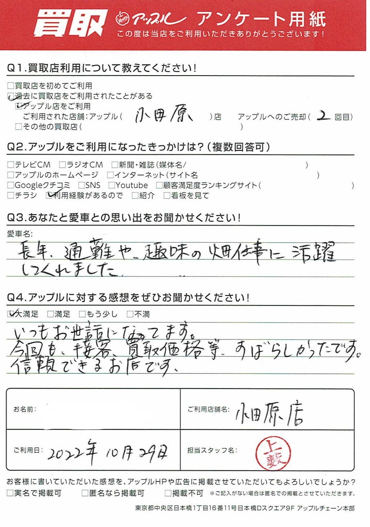 お車のご相談・ 査定だけでもOK! カンタン 入力 30秒 アップルがブランド買取始めました! お電話でも受付中! 受付時間10:00 ~ 19:00 0465-49-5503 お車のご相談・ 査定だけでもOK! カンタン 入力 30秒 アップルがブランド買取始めました! お電話でも受付中! 受付時間10:00 ~ 19:00 0465-49-5503 アップルがブランド買取始めました! お電話でも受付中! 受付時間10:00 ~ 19:00 0465-49-5503 店舗情報 在庫車 スタッフ紹介 ブログ お客様の声 キャンペーン 無料査定 click お客様の声 ご記入日: 2022/10/29 Y様 いつもお世話になってます。今回も接客、買取価格等、素晴らしかったです。信頼できるお店です。 前へ 次へ お客様の声一覧を見る