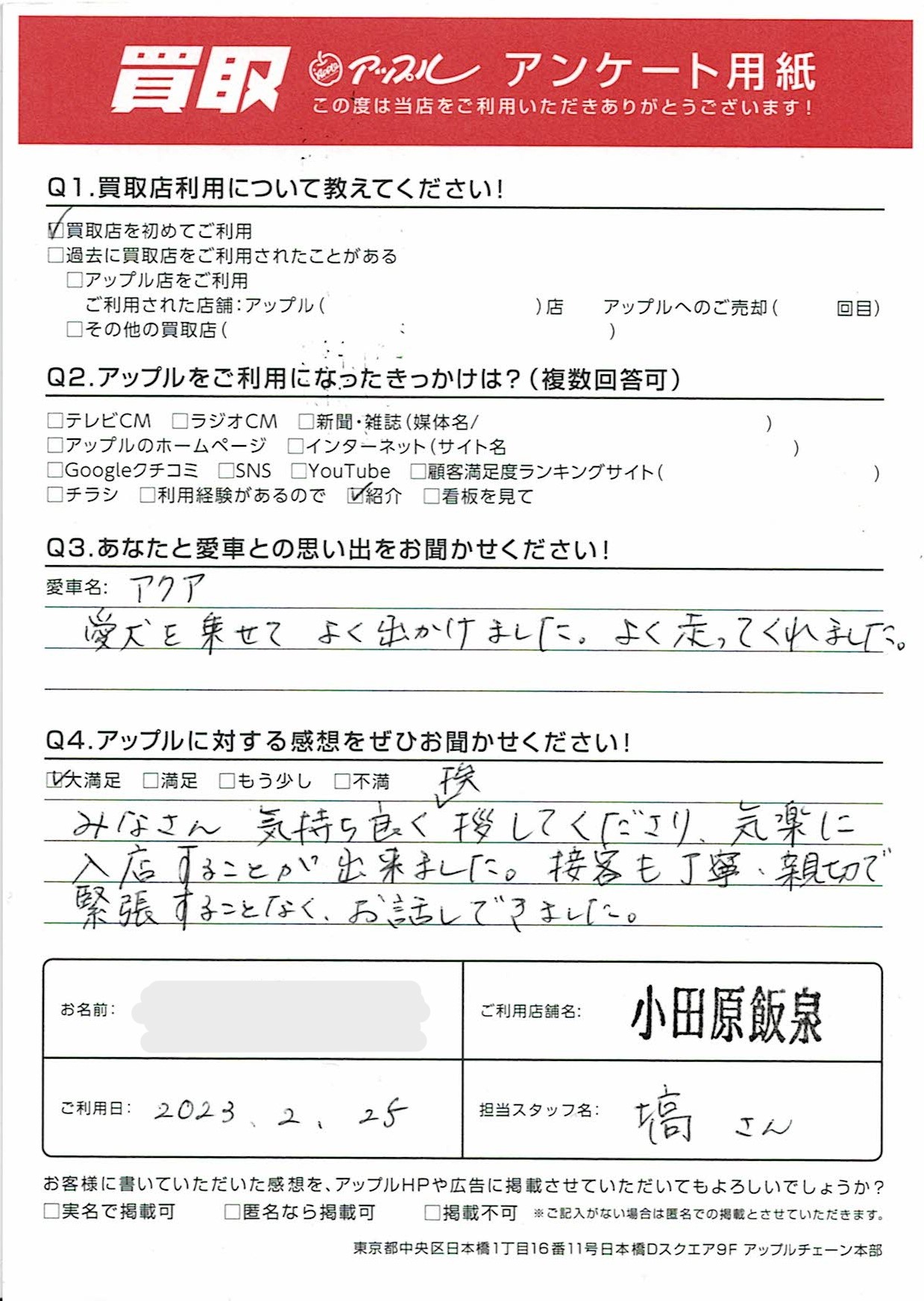 お車のご相談・ 査定だけでもOK! カンタン 入力 30秒 アップルがブランド買取始めました! お電話でも受付中! 受付時間10:00 ~ 19:00 0465-49-5503 お車のご相談・ 査定だけでもOK! カンタン 入力 30秒 アップルがブランド買取始めました! お電話でも受付中! 受付時間10:00 ~ 19:00 0465-49-5503 アップルがブランド買取始めました! お電話でも受付中! 受付時間10:00 ~ 19:00 0465-49-5503 店舗情報 在庫車 スタッフ紹介 ブログ お客様の声 キャンペーン 無料査定 click お客様の声 ご記入日: 2023/02/25 K様 車名:トヨタ アクア みなさん気持ち良く挨拶してくださり、気軽に入店することが出来ました。接客も丁寧・親切で緊張することなくお話しできました。 前へ 次へ お客様の声一覧を見る