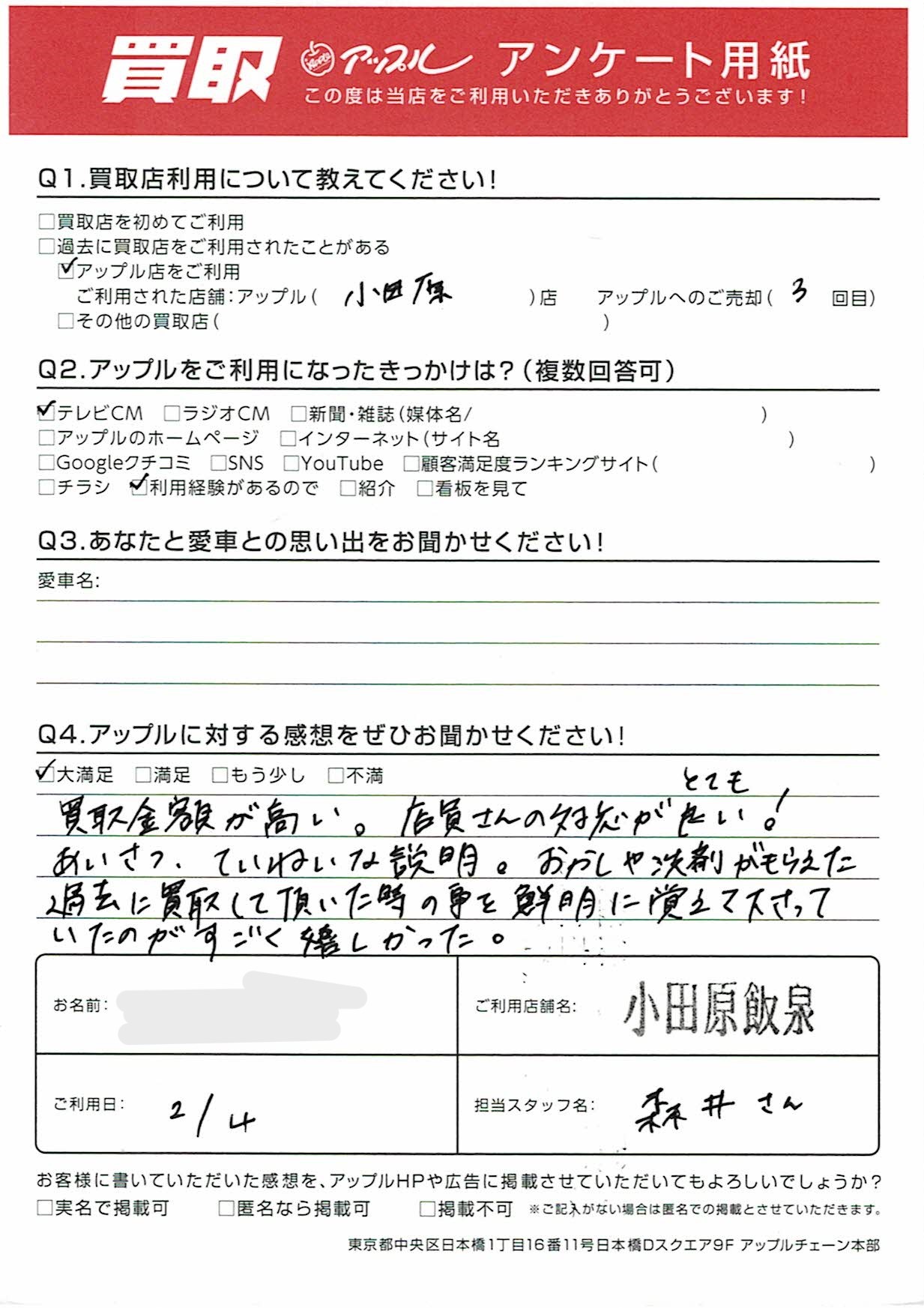 お車のご相談・ 査定だけでもOK! カンタン 入力 30秒 アップルがブランド買取始めました! お電話でも受付中! 受付時間10:00 ~ 19:00 0465-49-5503 お車のご相談・ 査定だけでもOK! カンタン 入力 30秒 アップルがブランド買取始めました! お電話でも受付中! 受付時間10:00 ~ 19:00 0465-49-5503 アップルがブランド買取始めました! お電話でも受付中! 受付時間10:00 ~ 19:00 0465-49-5503 店舗情報 在庫車 スタッフ紹介 ブログ お客様の声 キャンペーン 無料査定 click お客様の声 ご記入日: 2023/02/04 U様 車名:トヨタ スペイド 買取金額が高い。店員さんの対応がとても良い!あいさつ、ていねいな説明。おかしや洗剤がもらえた。過去に買取して頂いた時の事を鮮明に覚えて下さっていたのがすごく嬉しかった。 前へ 次へ お客様の声一覧を見る