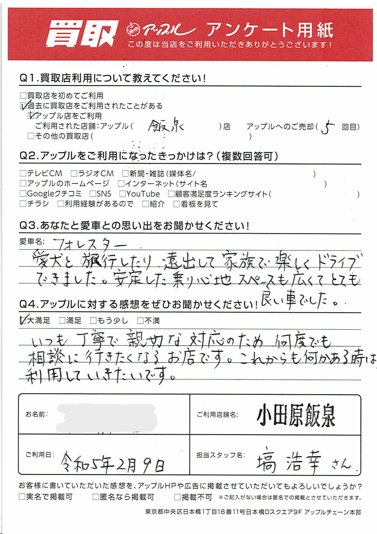 お車のご相談・ 査定だけでもOK! カンタン 入力 30秒 アップルがブランド買取始めました! お電話でも受付中! 受付時間10:00 ~ 19:00 0465-49-5503 お車のご相談・ 査定だけでもOK! カンタン 入力 30秒 アップルがブランド買取始めました! お電話でも受付中! 受付時間10:00 ~ 19:00 0465-49-5503 アップルがブランド買取始めました! お電話でも受付中! 受付時間10:00 ~ 19:00 0465-49-5503 店舗情報 在庫車 スタッフ紹介 ブログ お客様の声 キャンペーン 無料査定 click お客様の声 ご記入日: 2023/02/09 K様 車名:スバル フォレスター いつも丁寧で親切な対応のため、何度でも相談に行きたくなるお店です。これからも何かある時は利用していきたいです。 前へ 次へ お客様の声一覧を見る