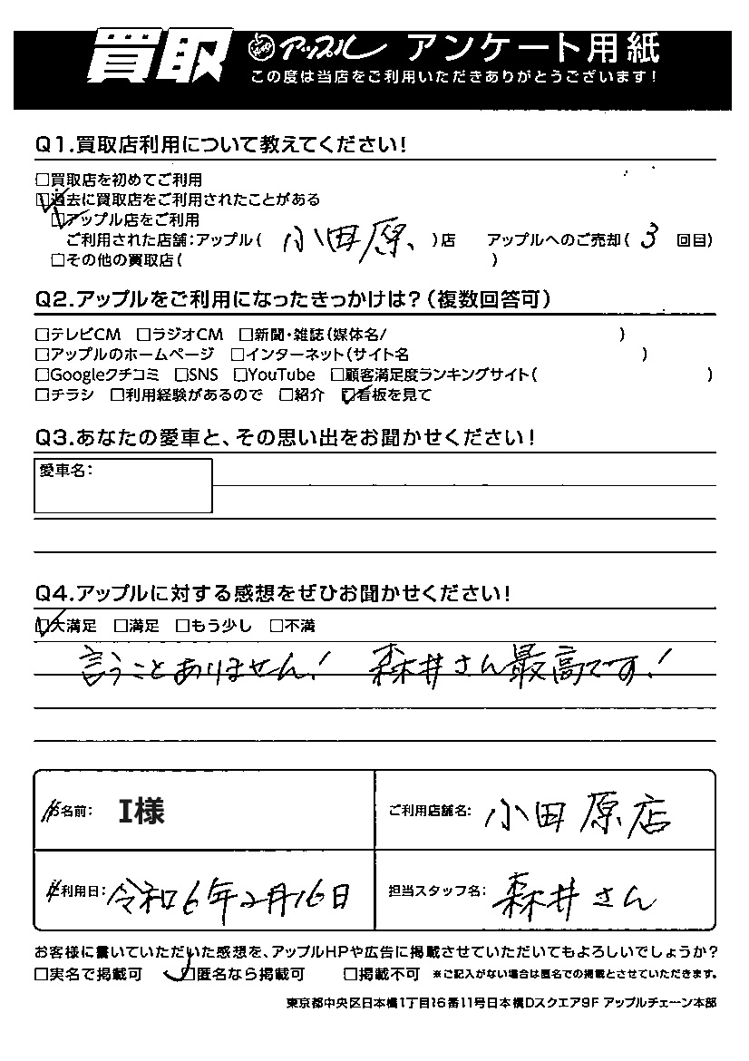 お車のご相談・ 査定だけでもOK! カンタン 入力 30秒 アップルがブランド買取始めました! お電話でも受付中! 受付時間10:00 ~ 19:00 0465-49-5503 お車のご相談・ 査定だけでもOK! カンタン 入力 30秒 アップルがブランド買取始めました! お電話でも受付中! 受付時間10:00 ~ 19:00 0465-49-5503 アップルがブランド買取始めました! お電話でも受付中! 受付時間10:00 ~ 19:00 0465-49-5503 店舗情報 在庫車 スタッフ紹介 ブログ お客様の声 キャンペーン 無料査定 click お客様の声 ご記入日: 2024/06/03 I様 ご利用日:令和6年2月16日 担当:森井アップルに対する感想をぜひお聞かせください!言うことありません! 森井さん最高です! 前へ 次へ お客様の声一覧を見る