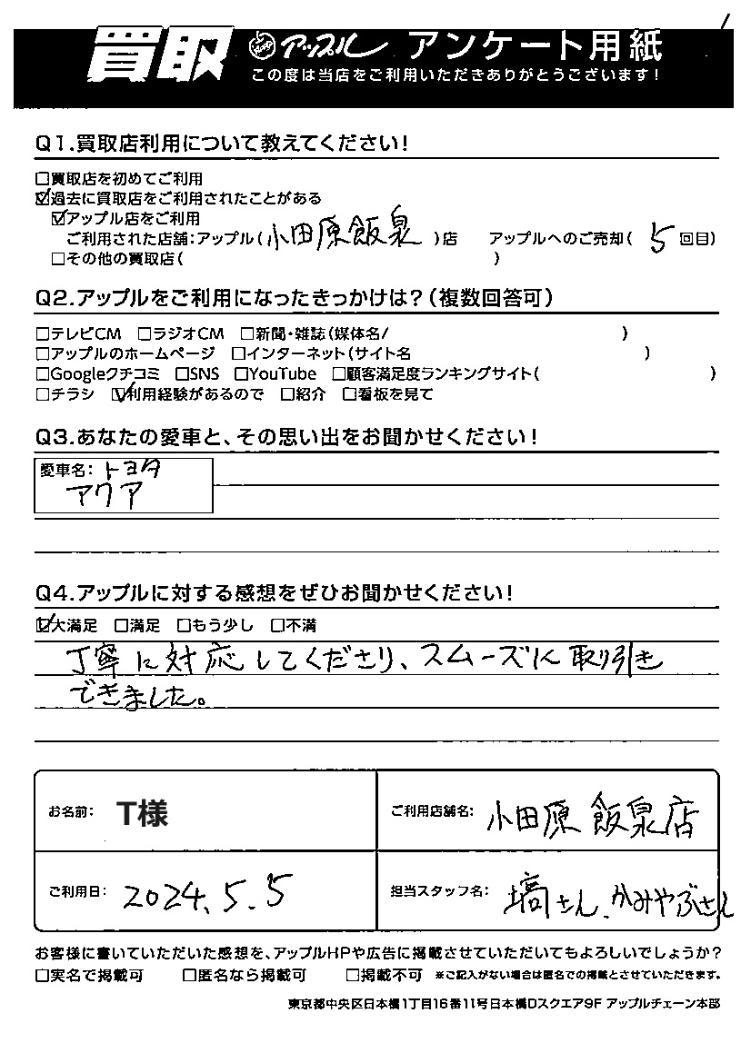 お車のご相談・ 査定だけでもOK! カンタン 入力 30秒 アップルがブランド買取始めました! お電話でも受付中! 受付時間10:00 ~ 19:00 0465-49-5503 お車のご相談・ 査定だけでもOK! カンタン 入力 30秒 アップルがブランド買取始めました! お電話でも受付中! 受付時間10:00 ~ 19:00 0465-49-5503 アップルがブランド買取始めました! お電話でも受付中! 受付時間10:00 ~ 19:00 0465-49-5503 店舗情報 在庫車 スタッフ紹介 ブログ お客様の声 キャンペーン 無料査定 click お客様の声 ご記入日: 2024/07/11 T様 車名:トヨタ アクア ご利用日:2024年5月5日 担当:塙・上藪アップルに対する感想をぜひお聞かせください!丁寧に対応してくださり、スムーズに取り引きできました。 前へ 次へ お客様の声一覧を見る