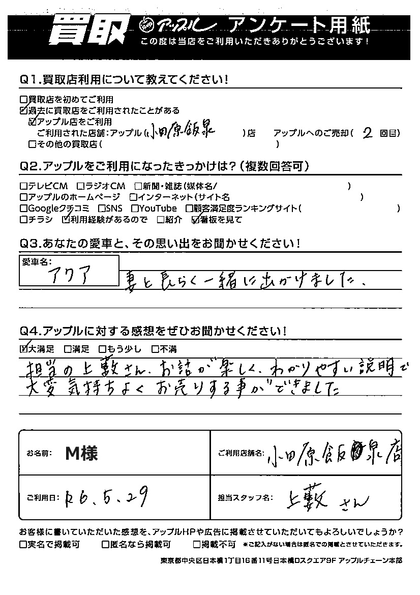 M様 車名:トヨタ アクア