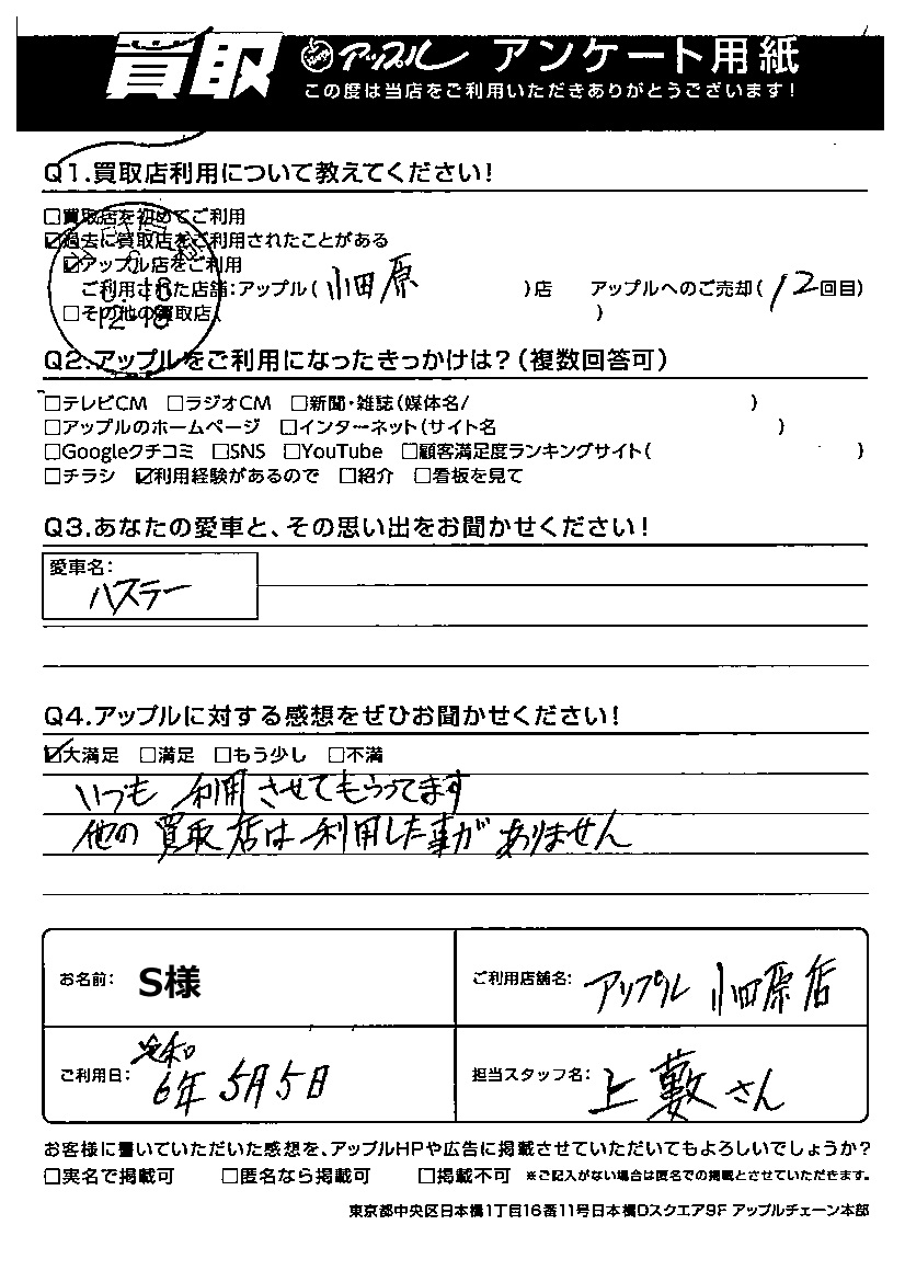 お車のご相談・ 査定だけでもOK! カンタン 入力 30秒 アップルがブランド買取始めました! お電話でも受付中! 受付時間10:00 ~ 19:00 0465-49-5503 お車のご相談・ 査定だけでもOK! カンタン 入力 30秒 アップルがブランド買取始めました! お電話でも受付中! 受付時間10:00 ~ 19:00 0465-49-5503 アップルがブランド買取始めました! お電話でも受付中! 受付時間10:00 ~ 19:00 0465-49-5503 店舗情報 在庫車 スタッフ紹介 ブログ お客様の声 キャンペーン 無料査定 click お客様の声 ご記入日: 2024/09/16 S様 車名:スズキ ハスラー ご利用日:令和6年5月5日 担当:上藪アップルに対する感想をぜひお聞かせください!いつも利用させてもらってます。他の買取店は利用した事がありません。 前へ 次へ お客様の声一覧を見る