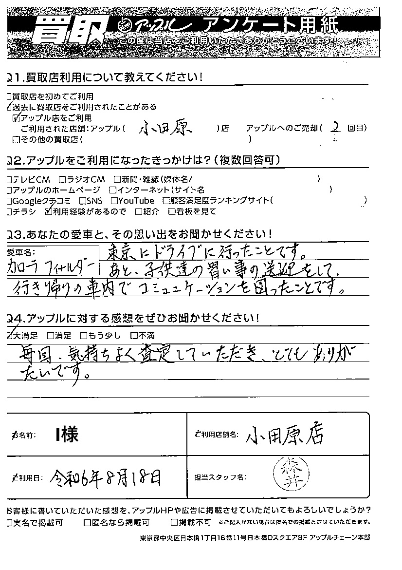 I様 車名:トヨタ カローラフィールダー フィールダー(カローラ)